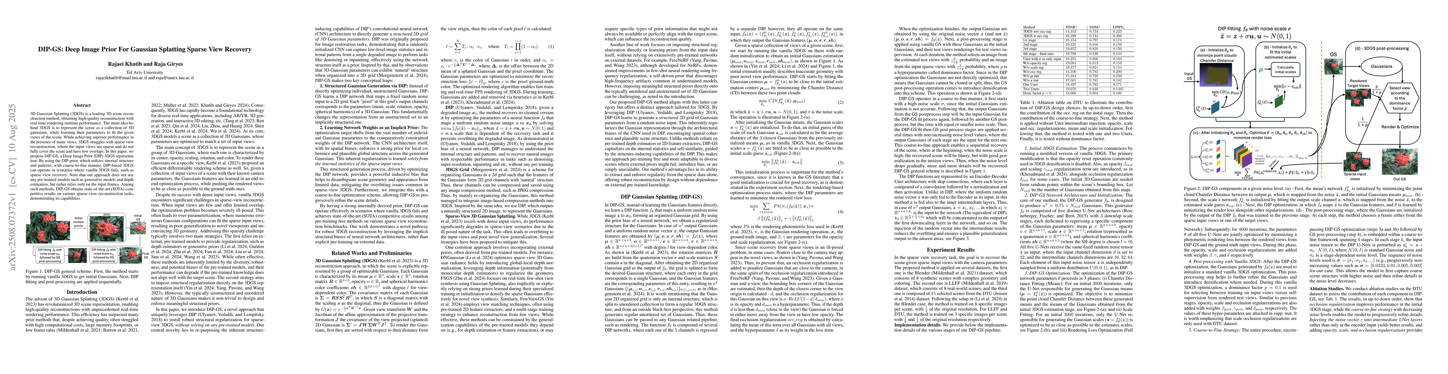 3D Gaussian Splatting (3DGS) is a leading 3D scene reconstruction method, obtaining high-quality reconstruction with real-time rendering runtime performance. The main idea behind 3DGS is to represent the scene as a collection of 3D gaussians, while learning their parameters to fit the given views of the scene. While achieving superior performance in the presence of many views, 3DGS struggles with sparse view reconstruction, where the input views are sparse and do not fully cover the scene and have low overlaps. In this paper, we propose DIP-GS, a Deep Image Prior (DIP) 3DGS representation. By using the DIP prior, which utilizes internal structure and patterns, with coarse-to-fine manner, DIP-based 3DGS can operate in scenarios where vanilla 3DGS fails, such as sparse view recovery. Note that our approach does not use any pre-trained models such as generative models and depth estimation, but rather relies only on the input frames. Among such methods, DIP-GS obtains state-of-the-art (SOTA) competitive results on various sparse-view reconstruction tasks, demonstrating its capabilities.