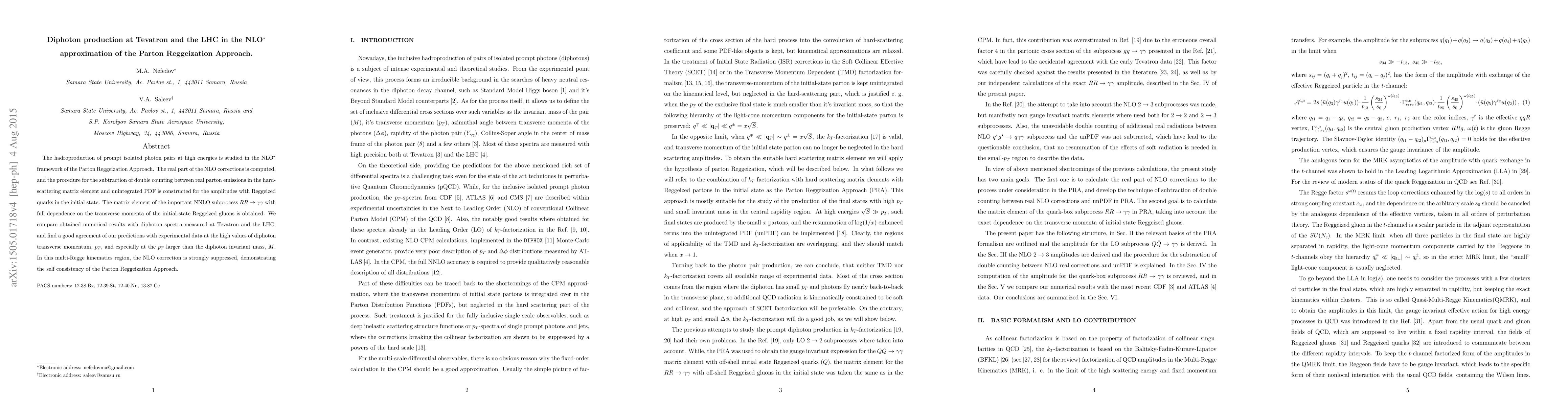 This paper studies high-energy diphoton pair production using the Parton Reggeization Approach in the NLO* framework, computing NLO corrections and constructing a double-counting subtraction procedure. Results show good agreement with Tevatron and LHC data, especially at high diphoton transverse momentum, validating the approach's self-consistency.