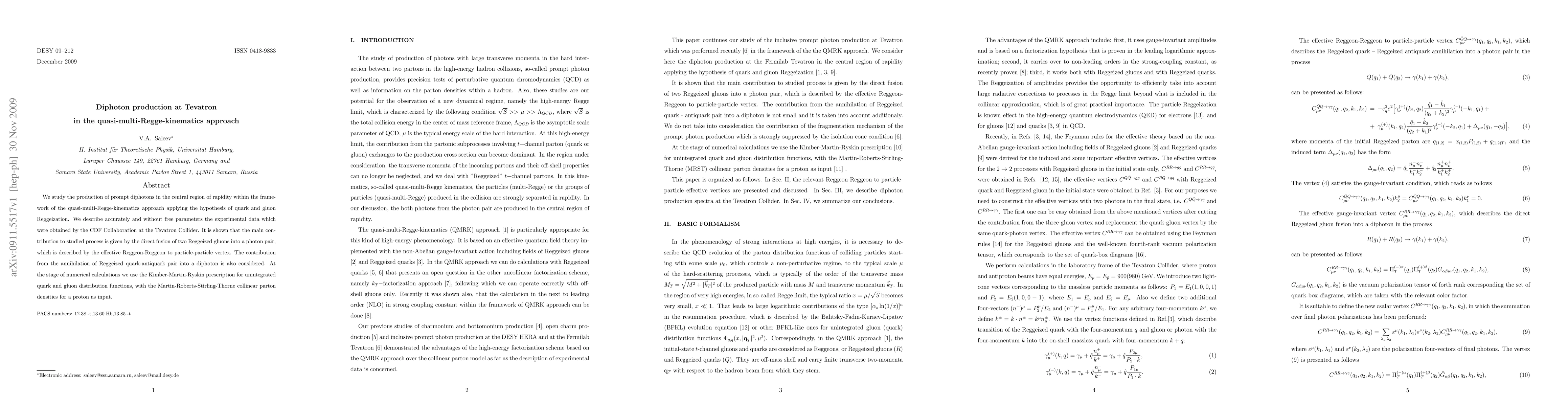 This paper investigates prompt diphoton production in the central region of rapidity using the quasi-multi-Regge-kinematics approach, demonstrating accurate agreement with CDF Collaboration data at the Tevatron. The main contribution is attributed to the direct fusion of two Reggeized gluons, with additional consideration of quark-antiquark annihilation.