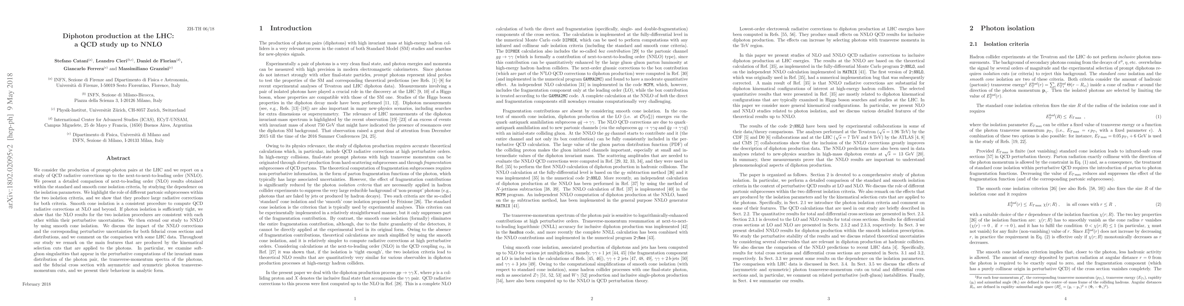 This study investigates QCD radiative corrections for diphoton production at the LHC up to next-to-next-to-leading order (NNLO), comparing NLO results under different photon isolation criteria. It finds that smooth cone isolation provides consistent results for NLO and NNLO, highlighting significant radiative corrections and discussing the impact of kinematical cuts and soft-gluon singularities.