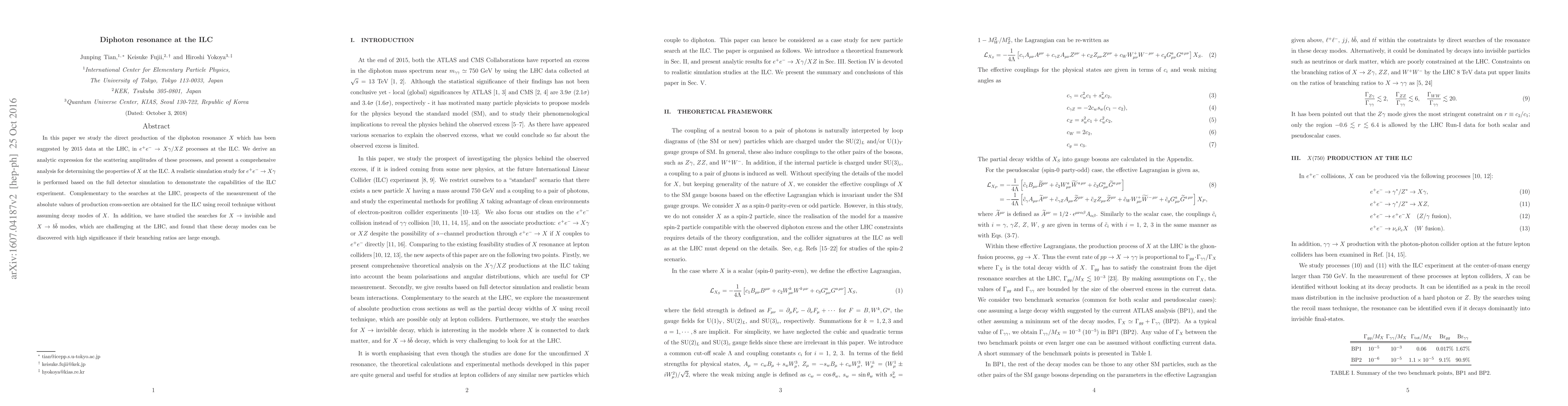 This paper investigates the production of a diphoton resonance X, hinted at in 2015 LHC data, at the International Linear Collider (ILC). It derives scattering amplitudes for e+e- to Xgamma/XZ processes, and simulates the e+e- to Xgamma reaction using full detector simulation to assess ILC's detection capabilities. The study also explores measuring X production cross-sections and discovering challenging decay modes like X->invisible and X->bb at the ILC.