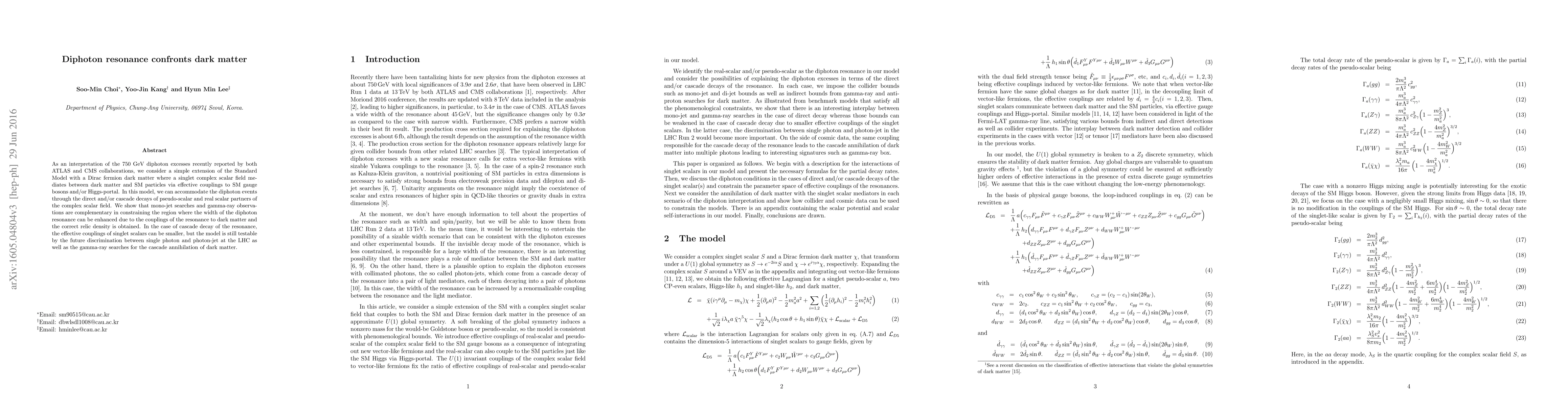 This paper explores a model extending the Standard Model to explain the 750 GeV diphoton excess via a Dirac fermion dark matter connected by a singlet complex scalar field. It demonstrates how the diphoton events can arise from the decay of scalar partners, and highlights the complementary roles of mono-jet searches and gamma-ray observations in constraining the model parameters.