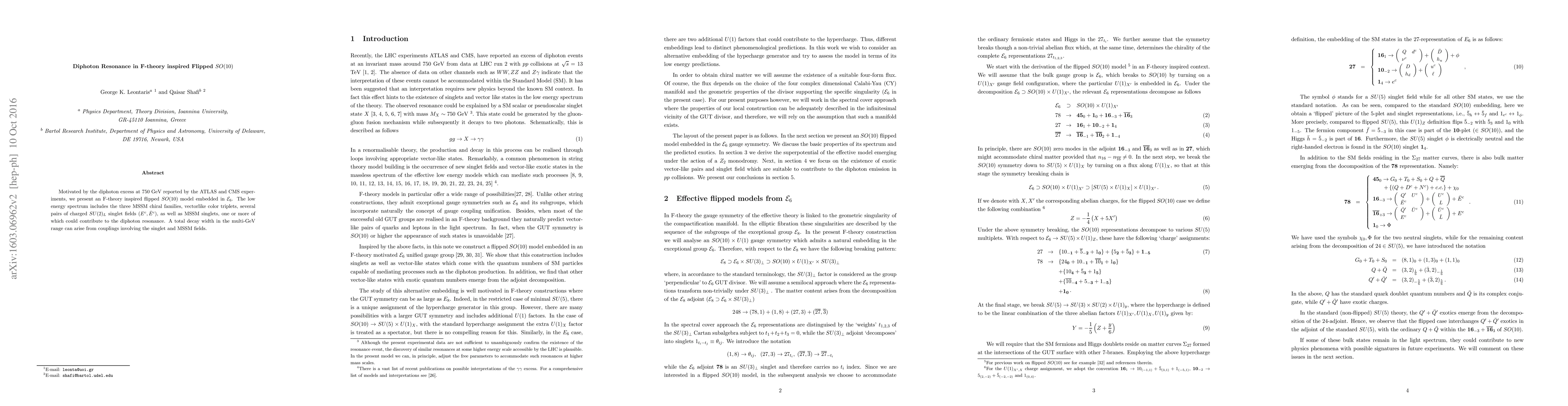 Motivated by the diphoton excess at 750 GeV reported by the ATLAS and CMS experiments, we present an F-theory inspired flipped $SO(10)$ model embedded in an $E_6$ GUT. The low energy spectrum includes the three MSSM chiral families, vectorlike color triplets, several pairs of charged $SU(2)_L$ singlet fields $(E^c, \bar E^c)$, as well as MSSM singlets, one or more of which can contribute to the resonance. Total decay width in the multi-GeV range can arise from couplings involving the singlet and MSSM fields