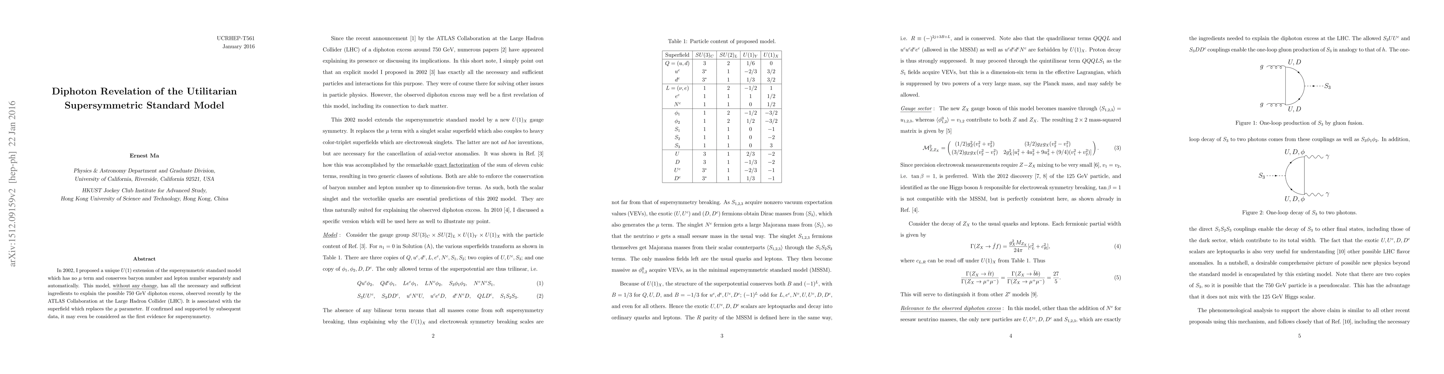 In 2002, I proposed a unique $U(1)$ extension of the supersymmetric standard model which has no $\mu$ term and conserves baryon number and lepton number separately and automatically. This model, ${without~any~change}$, has all the necessary and sufficient ingredients to explain the possible 750 GeV diphoton excess, observed recently by the ATLAS Collaboration at the Large Hadron Collider (LHC). It is associated with the superfield which replaces the $\mu$ parameter. If confirmed and supported by subsequent data, it may even be considered as the first evidence for supersymmetry.