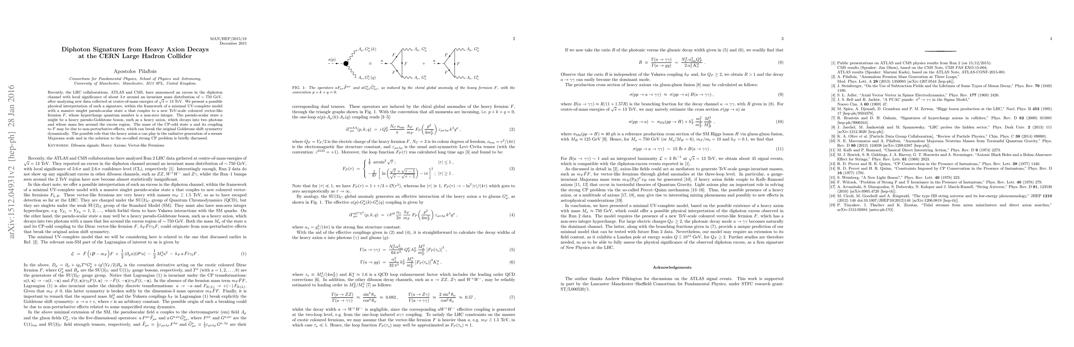 Recently, the LHC collaborations, ATLAS and CMS, have announced an excess in the diphoton channel with local significance of about $3\,\sigma$ around an invariant mass distribution of $\sim 750$ GeV, after analyzing new data collected at centre-of-mass energies of $\sqrt{s} = 13~{\rm TeV}$. We present a possible physical interpretation of such a signature, within the framework of a minimal UV-complete model with a massive singlet pseudo-scalar state $a$ that couples to a new TeV-scale coloured vector-like fermion $F$, whose hypercharge quantum number is a non-zero integer. The pseudo-scalar state $a$ might be a heavy pseudo-Goldstone boson, such as a heavy axion, which decays into two photons and whose mass lies around the excess region. The mass of the CP-odd state $a$ and its coupling to $F$ may be due to non-perturbative effects, which can break the original Goldstone shift symmetry dynamically. The possible role that the heavy axion $a$ can play in the radiative generation of a seesaw Majorana scale and in the solution to the so-called strong CP problem is briefly discussed.