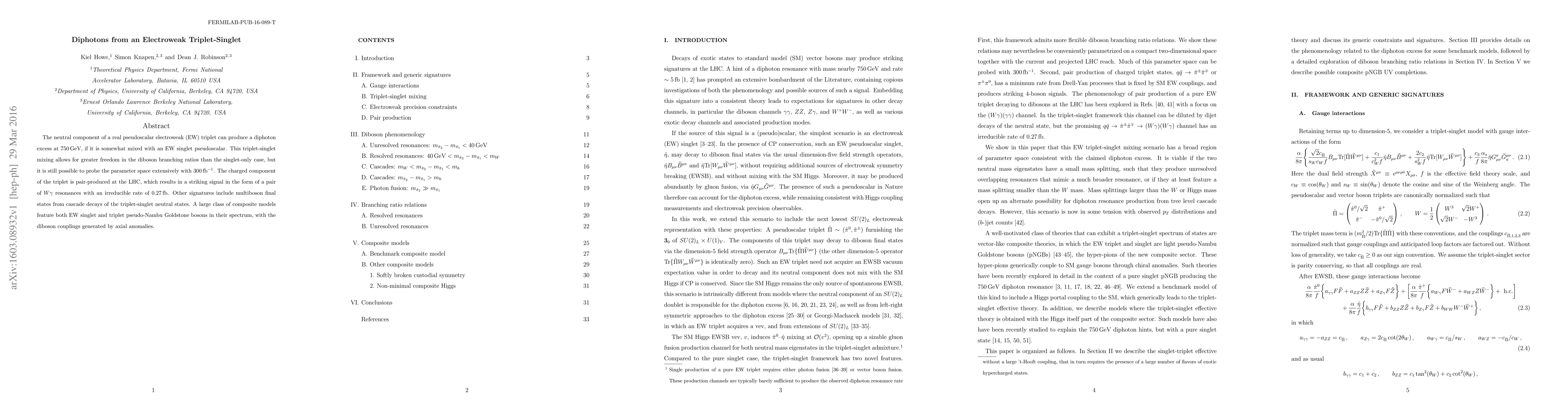 The neutral component of a real pseudoscalar electroweak (EW) triplet can produce a diphoton excess at 750 GeV, if it is somewhat mixed with an EW singlet pseudoscalar. This triplet-singlet mixing allows for greater freedom in the diboson branching ratios than the singlet-only case, but it is still possible to probe the parameter space extensively with 300 fb$^{-1}$. The charged component of the triplet is pair-produced at the LHC, which results in a striking signal in the form of a pair of $W\gamma$ resonances with an irreducible rate of 0.27 fb. Other signatures include multiboson final states from cascade decays of the triplet-singlet neutral states. A large class of composite models feature both EW singlet and triplet pseudo-Nambu Goldstone bosons in their spectrum, with the diboson couplings generated by axial anomalies.