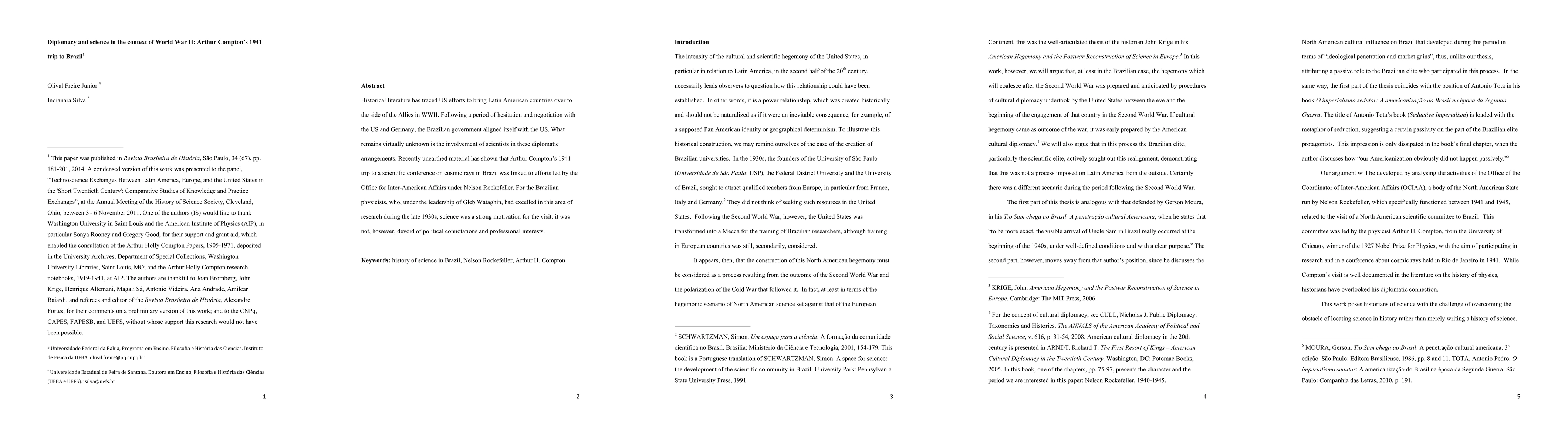 Historical literature has traced US efforts to bring Latin American countries over to the side of the Allies in WWII. Following a period of hesitation and negotiation with the US and Germany, the Brazilian government aligned itself with the US. What remains virtually unknown is the involvement of scientists in these diplomatic arrangements. Recently unearthed material has shown that Arthur Compton's 1941 trip to a scientific conference on cosmic rays in Brazil was linked to efforts led by the Office for Inter-American Affairs under Nelson Rockefeller. For the Brazilian physicists, who, under the leadership of Gleb Wataghin, had excelled in this area of research during the late 1930s, science was a strong motivation for the visit; it was not, however, devoid of political connotations and professional interests.