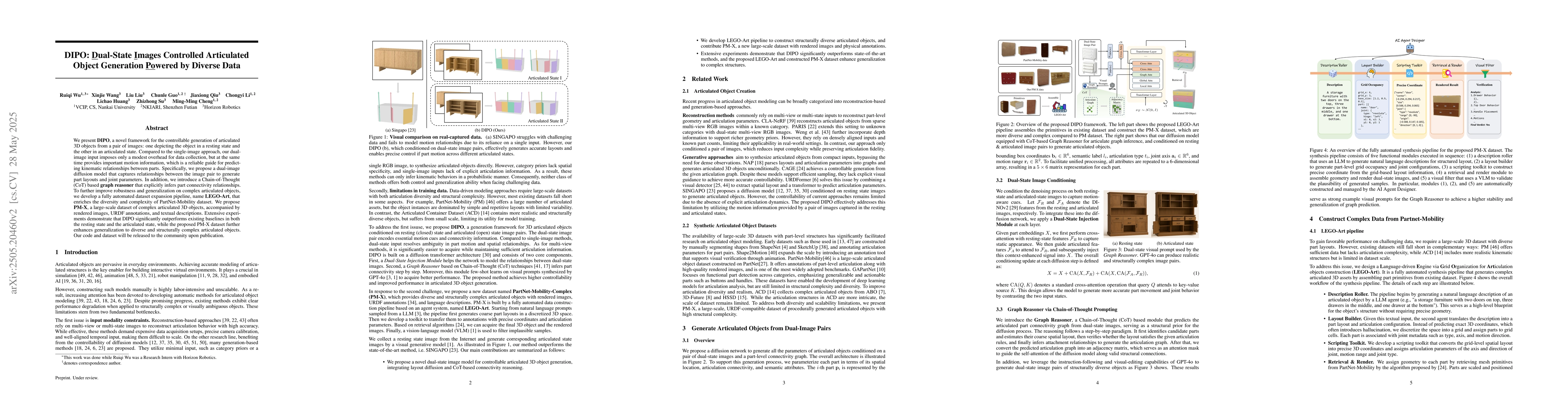 We present DIPO, a novel framework for the controllable generation of articulated 3D objects from a pair of images: one depicting the object in a resting state and the other in an articulated state. Compared to the single-image approach, our dual-image input imposes only a modest overhead for data collection, but at the same time provides important motion information, which is a reliable guide for predicting kinematic relationships between parts. Specifically, we propose a dual-image diffusion model that captures relationships between the image pair to generate part layouts and joint parameters. In addition, we introduce a Chain-of-Thought (CoT) based graph reasoner that explicitly infers part connectivity relationships. To further improve robustness and generalization on complex articulated objects, we develop a fully automated dataset expansion pipeline, name LEGO-Art, that enriches the diversity and complexity of PartNet-Mobility dataset. We propose PM-X, a large-scale dataset of complex articulated 3D objects, accompanied by rendered images, URDF annotations, and textual descriptions. Extensive experiments demonstrate that DIPO significantly outperforms existing baselines in both the resting state and the articulated state, while the proposed PM-X dataset further enhances generalization to diverse and structurally complex articulated objects. Our code and dataset will be released to the community upon publication.