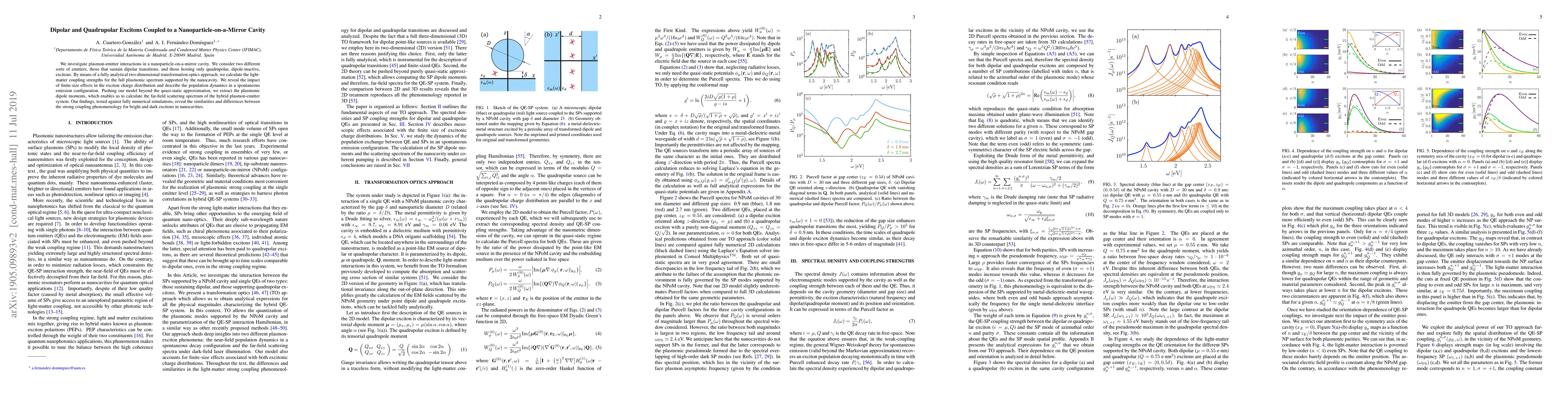 We investigate plasmon-emitter interactions in a nanoparticle-on-a-mirror cavity. We consider two different sorts of emitters, those that sustain dipolar transitions, and those hosting only quadrupolar, dipole-inactive, excitons. By means of a fully analytical two-dimensional transformation optics approach, we calculate the light-matter coupling strengths for the full plasmonic spectrum supported by the nanocavity. We reveal the impact of finite-size effects in the exciton charge distribution and describe the population dynamics in a spontaneous emission configuration. Pushing our model beyond the quasi-static approximation, we extract the plasmonic dipole moments, which enables us to calculate the far-field scattering spectrum of the hybrid plasmon-emitter system. Our findings, tested against fully numerical simulations, reveal the similarities and differences between the strong coupling phenomenology for bright and dark excitons in nanocavities.