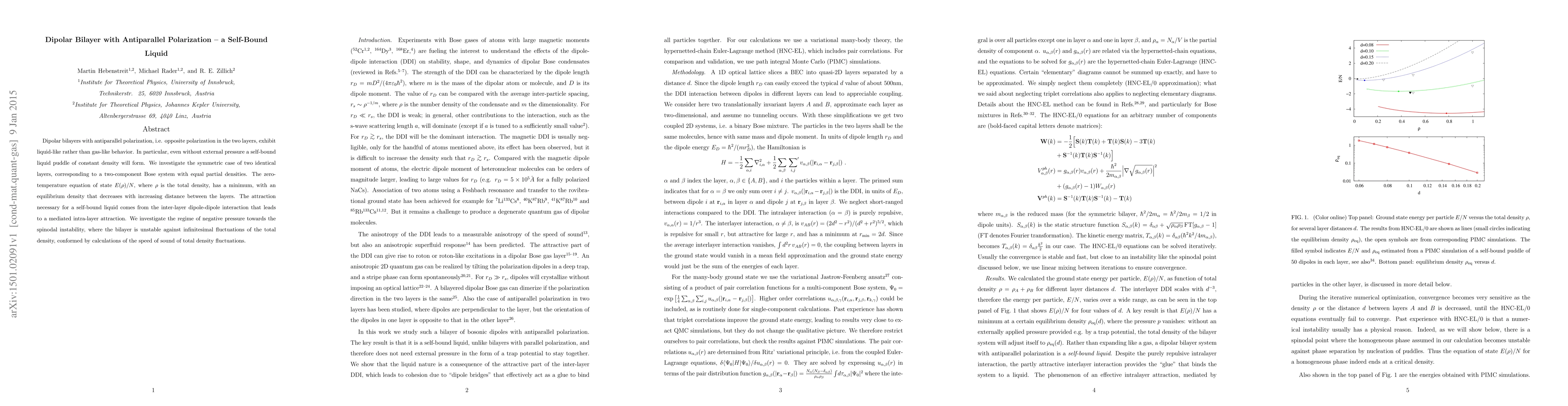 Dipolar bilayers with opposite polarization exhibit self-bound liquid behavior at zero temperature, with a minimum equation of state and equilibrium density that decreases with distance between layers.