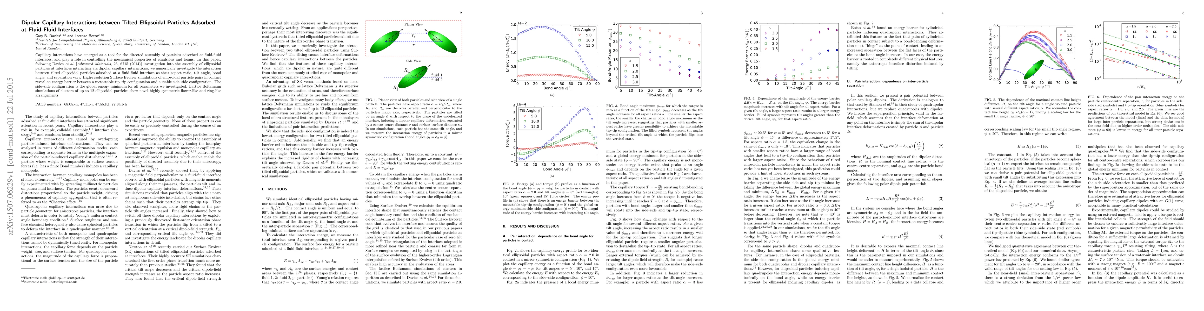 Capillary interactions have emerged as a tool for the directed assembly of particles adsorbed at fluid-fluid interfaces, and play a role in controlling the mechanical properties of emulsions and foams. In this paper, following Davies et al. [Advanced Materials, 26, 6715 (2014)] investigation into the assembly of ellipsoidal particles at interfaces interacting via dipolar capillary interactions, we numerically investigate the interaction between tilted ellipsoidal particles adsorbed at a fluid-fluid interface as their aspect ratio, tilt angle, bond angle, and separation vary. High-resolution Surface Evolver simulations of ellipsoidal particle pairs in contact reveal an energy barrier between a metastable tip-tip configuration and a stable side-side configuration. The side-side configuration is the global energy minimum for all parameters we investigated. Lattice Boltzmann simulations of clusters of up to 12 ellipsoidal particles show novel highly symmetric flower-like and ring-like arrangements.