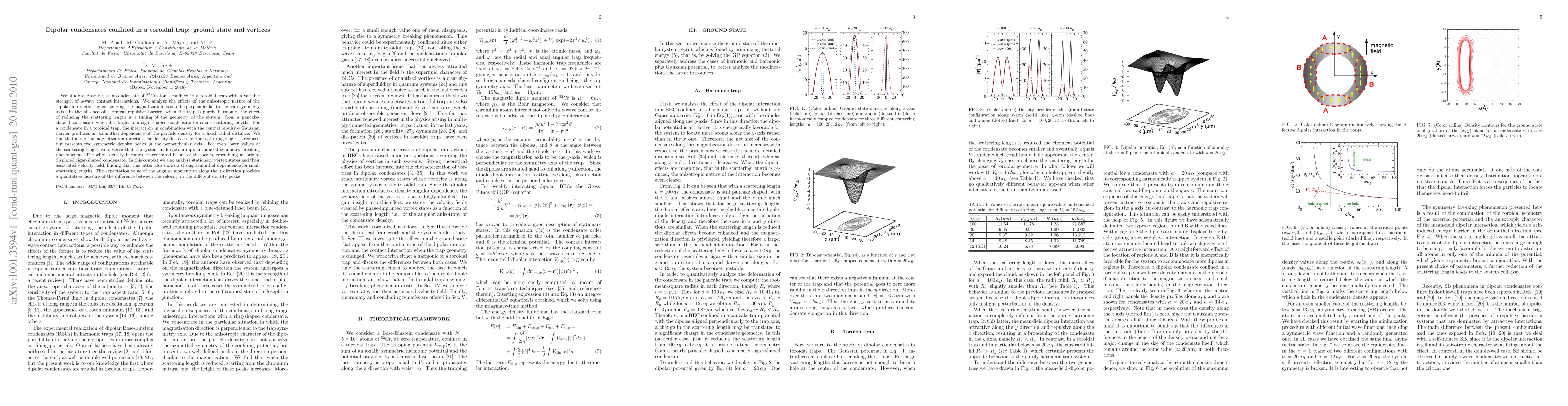 We study a Bose-Einstein condensate of 52Cr atoms confined in a toroidal trap with a variable strength of s-wave contact interactions. We analyze the effects of the anisotropic nature of the dipolar interaction by considering the magnetization axis to be perpendicular to the trap symmetry axis. In the absence of a central repulsive barrier, when the trap is purely harmonic, the effect of reducing the scattering length is a tuning of the geometry of the system: from a pancake-shaped condensate when it is large, to a cigar-shaped condensate for small scattering lengths. For a condensate in a toroidal trap, the interaction in combination with the central repulsive Gaussian barrier produces an azimuthal dependence of the particle density for a fixed radial distance. We find that along the magnetization direction the density decreases as the scattering length is reduced but presents two symmetric density peaks in the perpendicular axis. For even lower values of the scattering length we observe that the system undergoes a dipolar-induced symmetry breaking phenomenon. The whole density becomes concentrated in one of the peaks, resembling an origin-displaced cigar-shaped condensate. In this context we also analyze stationary vortex states and their associated velocity field, finding that this latter also shows a strong azimuthal dependence for small scattering lengths. The expectation value of the angular momentum along the z direction provides a qualitative measure of the difference between the velocity in the different density peaks.