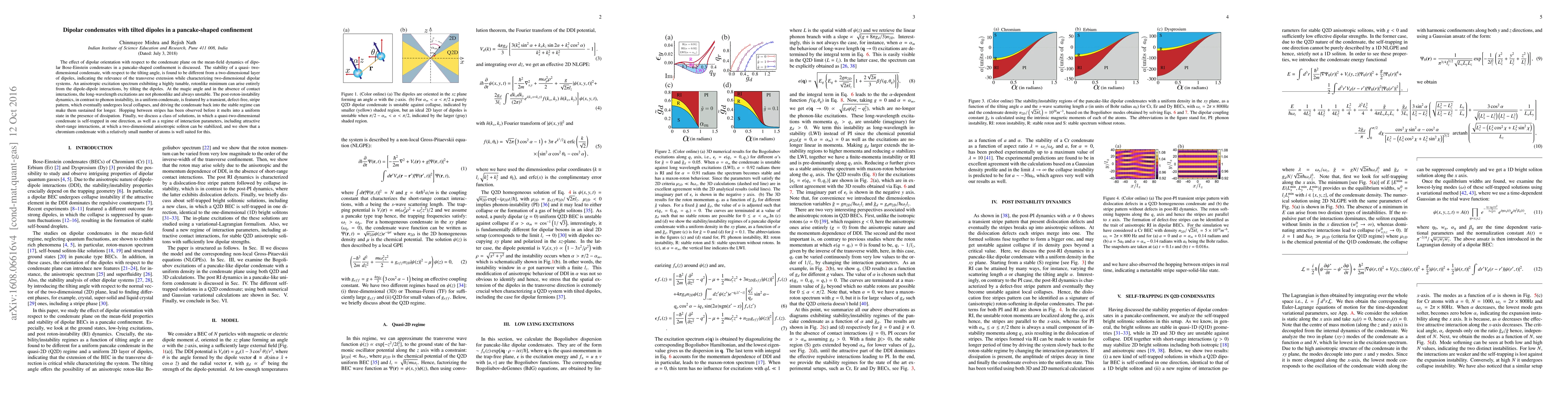 The effect of dipolar orientation with respect to the condensate plane on the mean-field dynamics of dipolar Bose-Einstein condensates in a pancake-shaped confinement is discussed. The stability of a quasi-two-dimensional condensate, with respect to the tilting angle, is found to be different from a two-dimensional layer of dipoles, indicating the relevance of the transverse extension while characterizing two-dimensional dipolar systems. An anisotropic excitation spectrum exhibiting a highly tunable, rotonlike minimum can arise entirely from the dipole-dipole interactions, by tilting the dipoles. At the magic angle and in the absence of contact interactions, the long-wavelength excitations are not phononlike and always unstable. The post-roton-instability dynamics, in contrast to phonon instability, in a uniform condensate, is featured by a transient, defect-free, stripe pattern, which eventually undergoes local collapses, and driving the condensate back into the stable regime can make them sustained for longer. Hopping between stripes has been observed before it melts into a uniform state in the presence of dissipation. Finally, we discuss a class of solutions, in which a quasi-two-dimensional condensate is self-trapped in one direction, as well as a regime of interaction parameters, including attractive short-range interactions, at which a two-dimensional anisotropic soliton can be stabilized, and we show that a chromium condensate with a relatively small number of atoms is well suited for this.