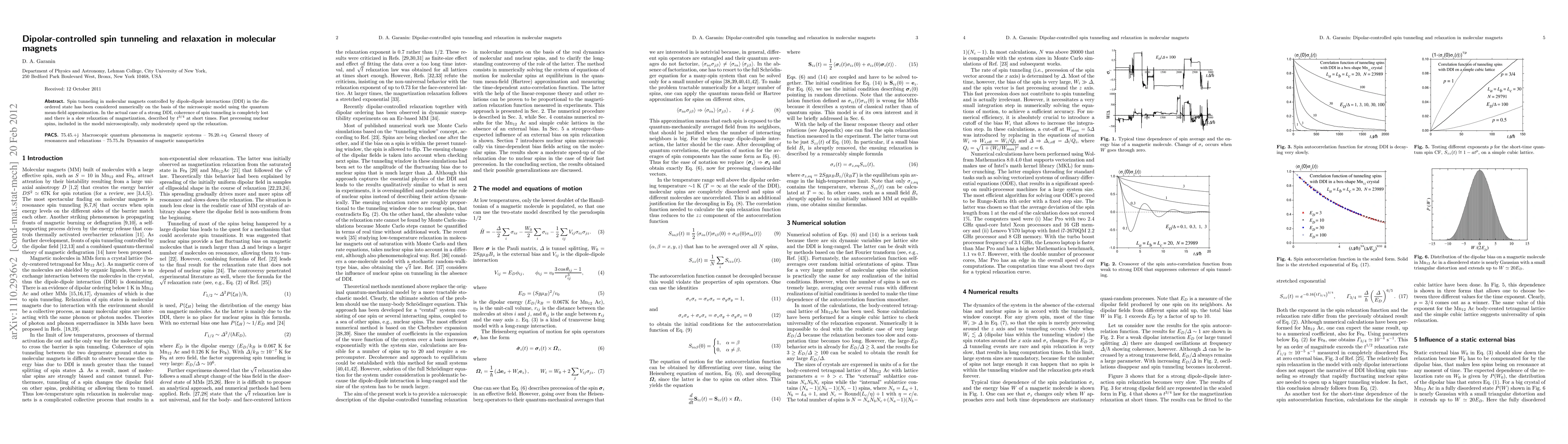 This paper investigates spin tunneling in molecular magnets under the influence of strong dipole-dipole interactions using a quantum mean-field approximation, finding that while nuclear spins slightly accelerate relaxation, the primary relaxation mechanism follows a t^{3/4} time dependence at short times.