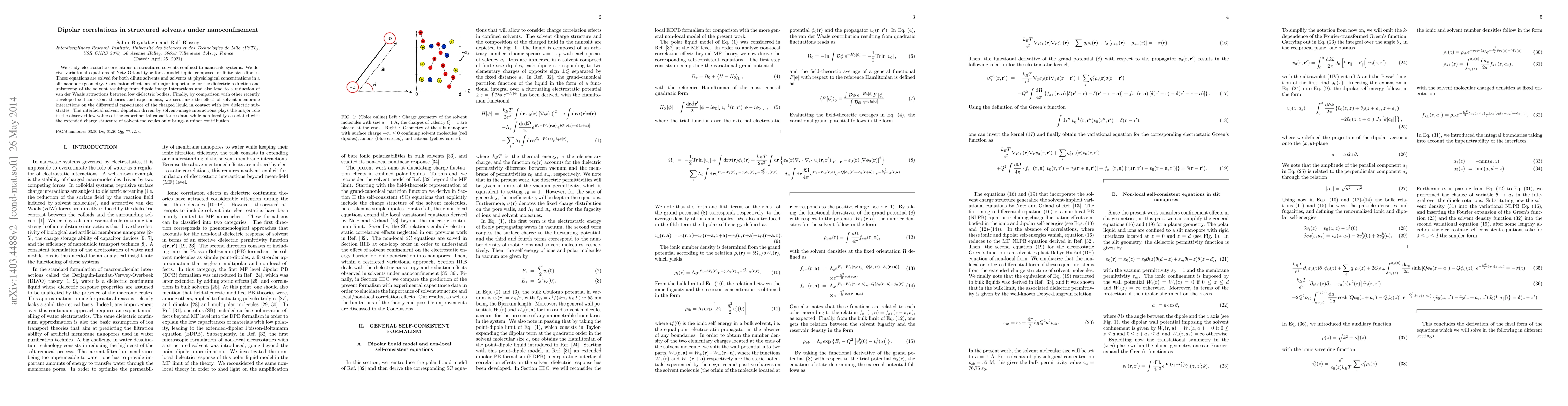 This paper investigates electrostatic correlations in structured solvents confined within nanoscale systems, deriving and solving Netz-Orland type equations for finite size dipoles. It highlights the significant role of correlation effects in dielectric reduction and anisotropy, and examines the impact of solvent-membrane interactions on differential capacitance, attributing low experimental capacitance values mainly to interfacial solvent depletion.