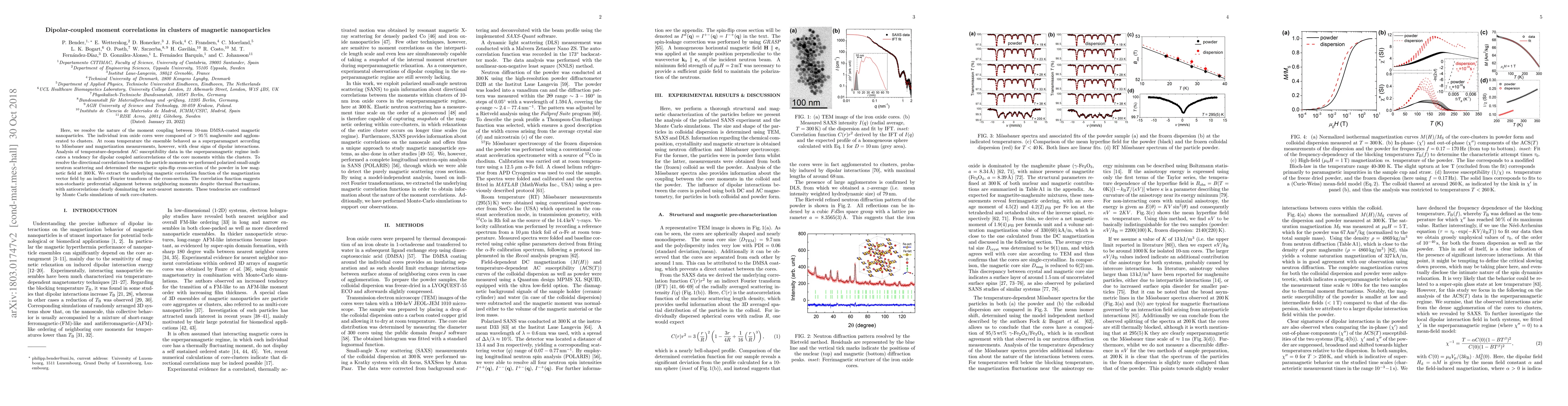 Here, we investigate the nature of the moment coupling between 10-nm DMSA-coated magnetic nanoparticles, in both colloidal dispersion and in powder form. The individual iron oxide cores were composed of > 95% maghemite and agglomerated to clusters. At room temperature the ensemble behaved as a superparamagnet according to M\"ossbauer and magnetization measurements, however, with clear signs of dipolar interactions at low temperatures. Analysis of temperature-dependent AC susceptibility data in the superparamagnetic regime indicates a tendency for dipolar coupled anticorrelations of the core moments within the clusters. To resolve the directional correlations between the particle moments we performed polarized small-angle neutron scattering and determined the magnetic spin-flip cross-section of the powder in low magnetic field at 300 K. We extract the underlying pair distance distribution function of the magnetization vector field by an indirect Fourier transform of the cross-section, and which suggests positive as well as negative correlations between nearest neighbor moments, with anticorrelations clearly dominating for next-nearest moments. These tendencies are confirmed by Monte Carlo simulations of such core-clusters.