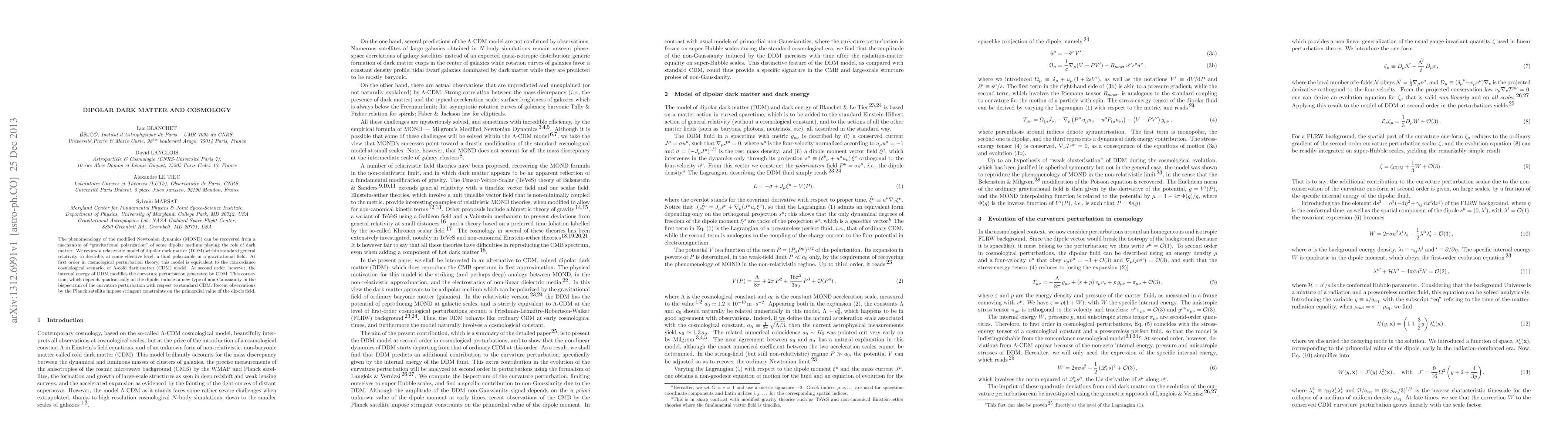 The phenomenology of the modified Newtonian dynamics (MOND) can be recovered from a mechanism of "gravitational polarization" of some dipolar medium playing the role of dark matter. We review a relativistic model of dipolar dark matter (DDM) within standard general relativity to describe, at some effective level, a fluid polarizable in a gravitational field. At first order in cosmological perturbation theory, this model is equivalent to the concordance cosmological scenario, or Lambda-cold dark matter (CDM) model. At second order, however, the internal energy of DDM modifies the curvature perturbation generated by CDM. This correction, which depends quadratically on the dipole, induces a new type of non-Gaussianity in the bispectrum of the curvature perturbation with respect to standard CDM. Recent observations by the Planck satellite impose stringent constraints on the primordial value of the dipole field.
