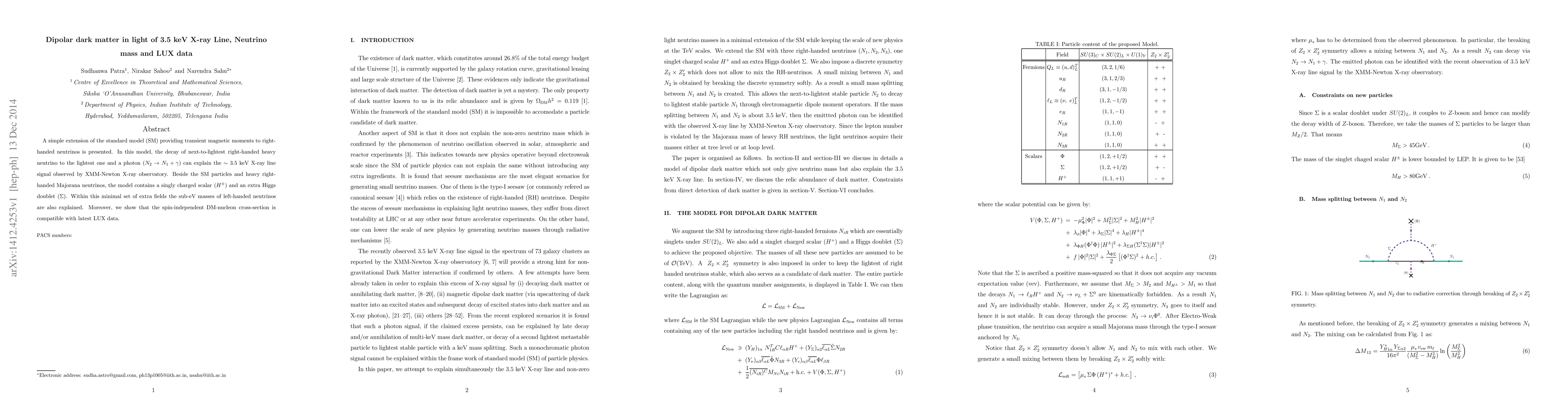 A new model explains the 3.5 keV X-ray line signal and compatible neutrino mass with a simple extension of the standard model, also predicting a viable spin-independent dark matter-nucleon cross-section.
