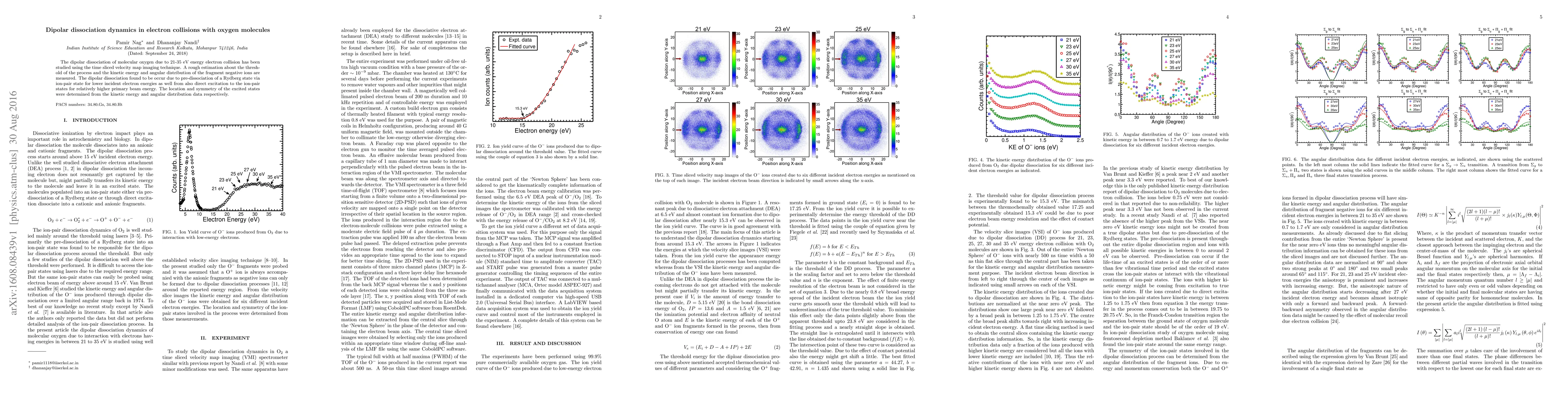 The dipolar dissociation of molecular oxygen due to 21-35 eV energy electron collision has been studied using the time sliced velocity map imaging technique. A rough estimation about the threshold of the process and the kinetic energy and angular distribution of the fragment negative ions are measured. The dipolar dissociation found to be occur due to pre-dissociation of a Rydberg state via ion-pair state for lower incident electron energies as well from also direct excitation to the ion-pair states for relatively higher primary beam energy. The location and symmetry of the excited states were determined from the kinetic energy and angular distribution data respectively.