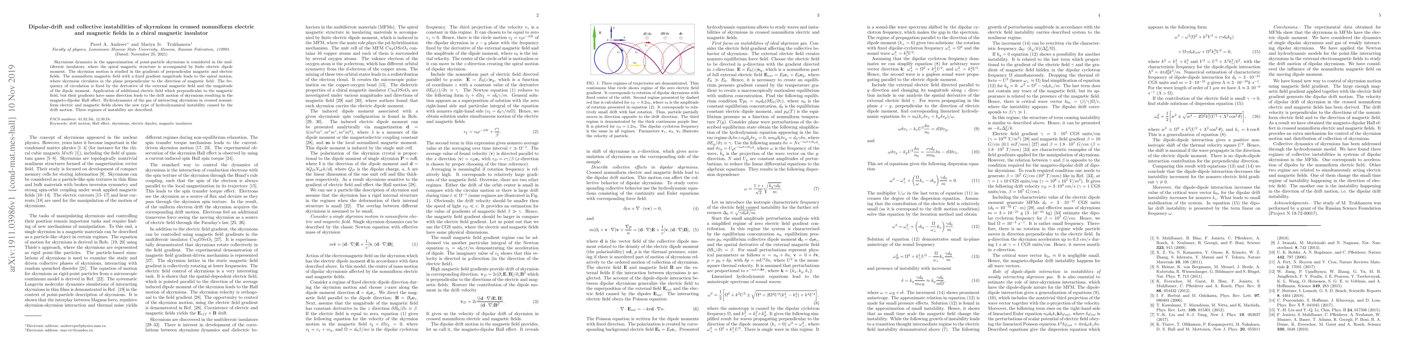 The paper presents a detailed analysis of dipolar-drift and collective instabilities of skyrmions in non-uniform electric and magnetic fields, deriving the drift velocity and magneto-dipolar Hall effect.