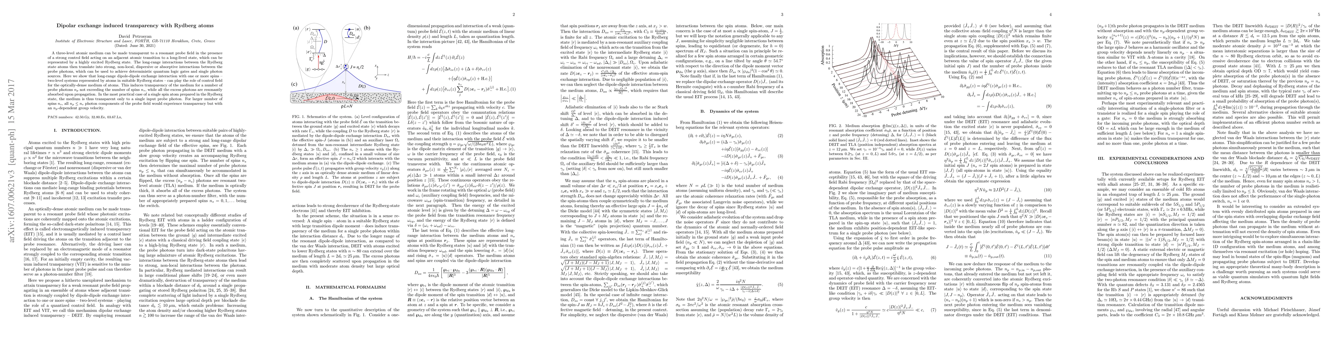 This paper demonstrates that dipolar exchange interactions between Rydberg atoms can induce transparency in a three-level atomic medium to a resonant probe field, allowing only a limited number of probe photons to pass through while absorbing the rest. This transparency mechanism can be used for deterministic quantum logic gates and single photon sources.