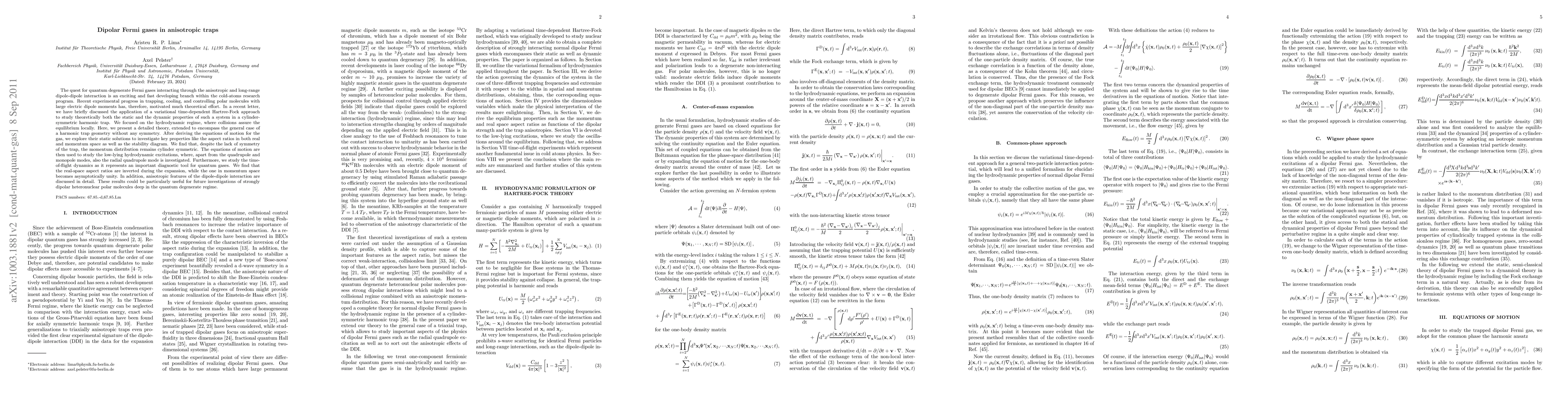 The paper presents a comprehensive theory for dipolar Fermi gases in anisotropic traps, including equations of motion, static solutions, and low-lying excitations, providing a detailed understanding of their behavior.