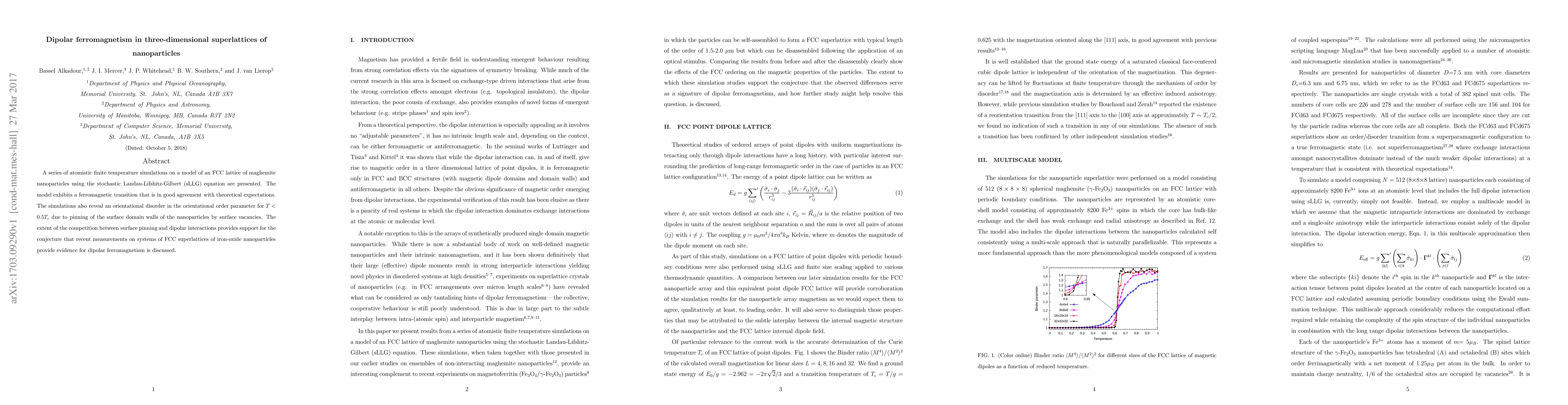Detailed atomistic simulations revealing the interplay between surface pinning and dipolar interactions in nanoparticle superlattices, providing evidence for dipolar ferromagnetism.