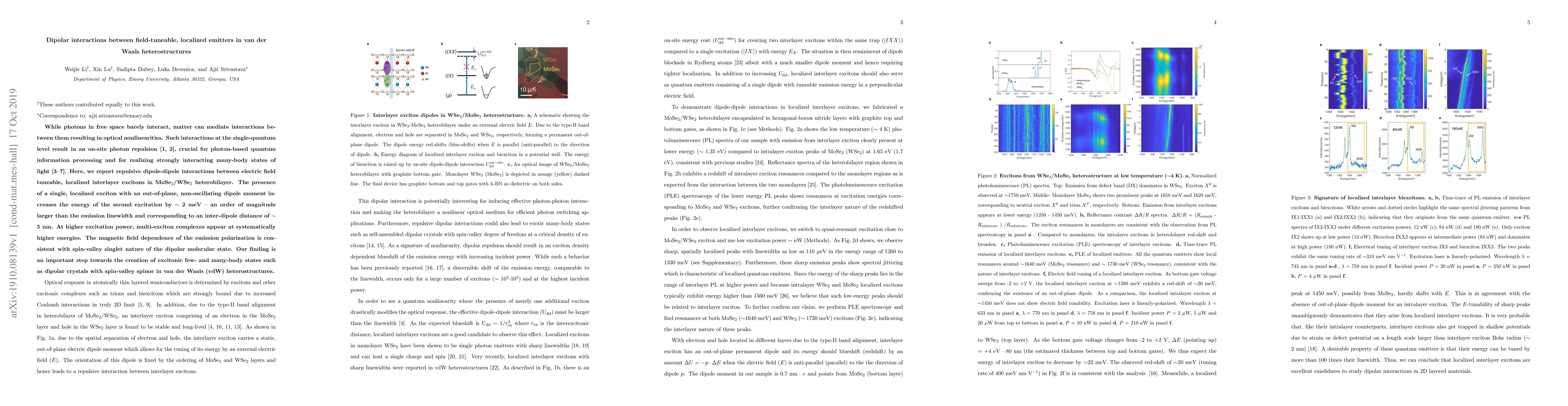 While photons in free space barely interact, matter can mediate interactions between them resulting in optical nonlinearities. Such interactions at the single-quantum level result in an on-site photon repulsion, crucial for photon-based quantum information processing and for realizing strongly interacting many-body states of light. Here, we report repulsive dipole-dipole interactions between electric field tuneable, localized interlayer excitons in MoSe$_2$/WSe$_2$ heterobilayer. The presence of a single, localized exciton with an out-of-plane, non-oscillating dipole moment increases the energy of the second excitation by $\sim$ 2 meV -- an order of magnitude larger than the emission linewidth and corresponding to an inter-dipole distance of $\sim$ 5 nm. At higher excitation power, multi-exciton complexes appear at systematically higher energies. The magnetic field dependence of the emission polarization is consistent with spin-valley singlet nature of the dipolar molecular state. Our finding is an important step towards the creation of excitonic few- and many-body states such as dipolar crystals with spin-valley spinor in van der Waals (vdW) heterostructures.