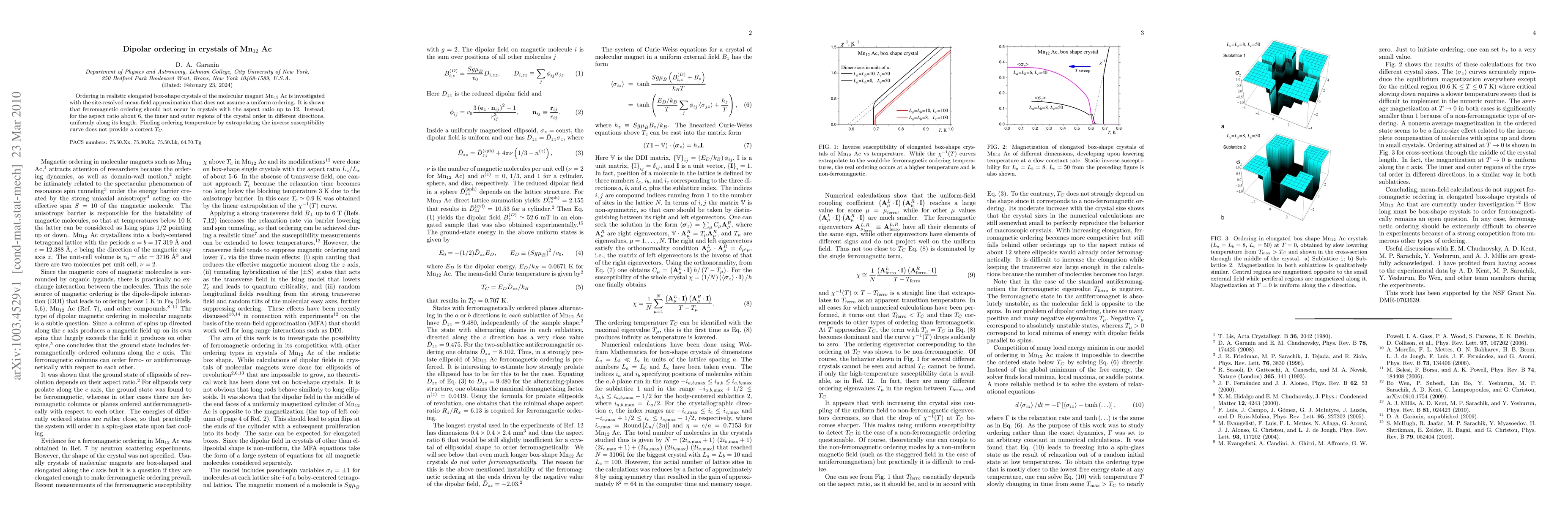 Researchers studied the magnetic ordering in crystals of Mn12 Ac, finding that ferromagnetic ordering is unlikely for elongated crystals with an aspect ratio up to 12, but may occur at a non-uniform temperature above 6 units along its length.