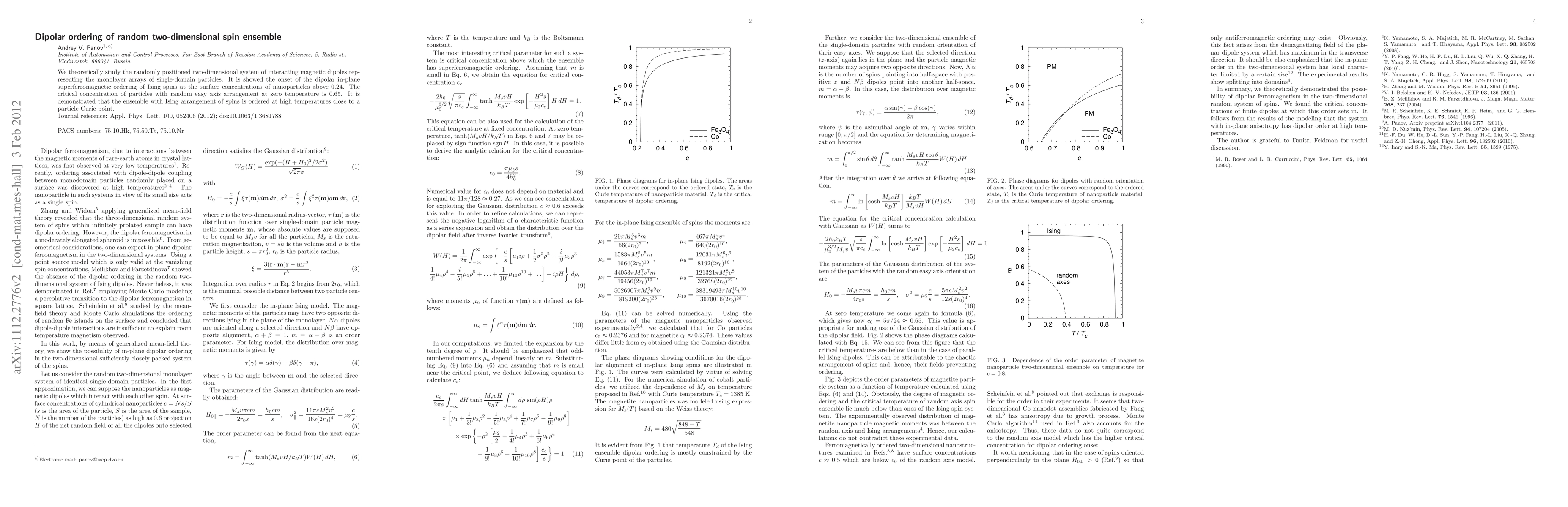 This paper investigates a two-dimensional system of randomly positioned magnetic dipoles, revealing the emergence of in-plane superferromagnetic ordering in Ising spins above a surface concentration of 0.24, with a critical concentration of 0.65 for random easy axis arrangement at zero temperature. The study also shows that the system exhibits ordering at high temperatures near the Curie point of individual particles.