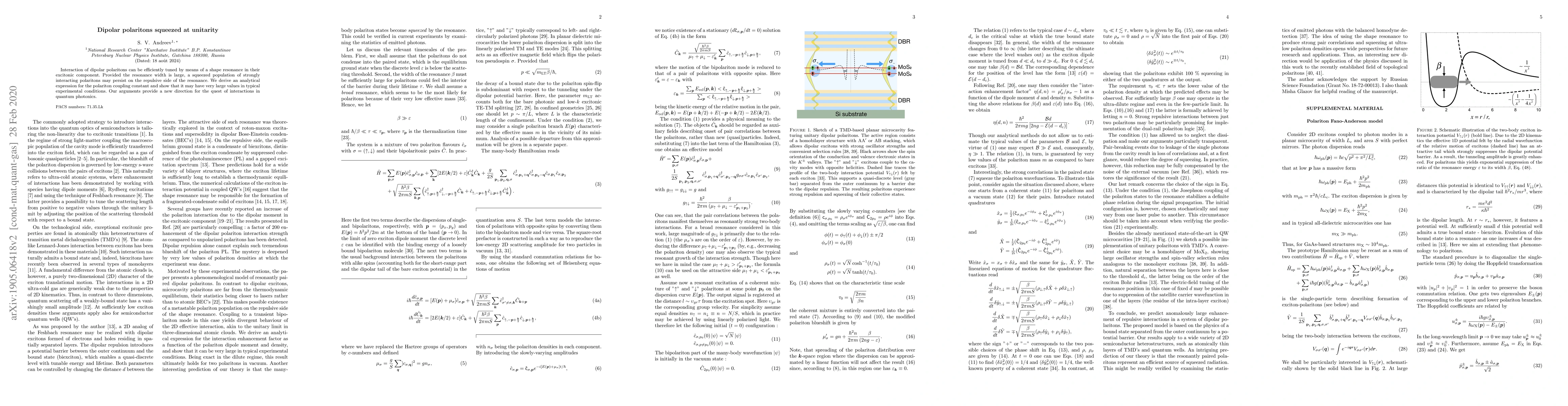 This paper explores the efficient tuning of dipolar polaritons through shape resonances in their excitonic component, demonstrating that large resonance widths can sustain a squeezed population of strongly interacting polaritons. The authors derive an analytical expression for the polariton coupling constant, revealing its potential for large values under typical experimental conditions, thus offering a new approach to interactions in quantum photonics.