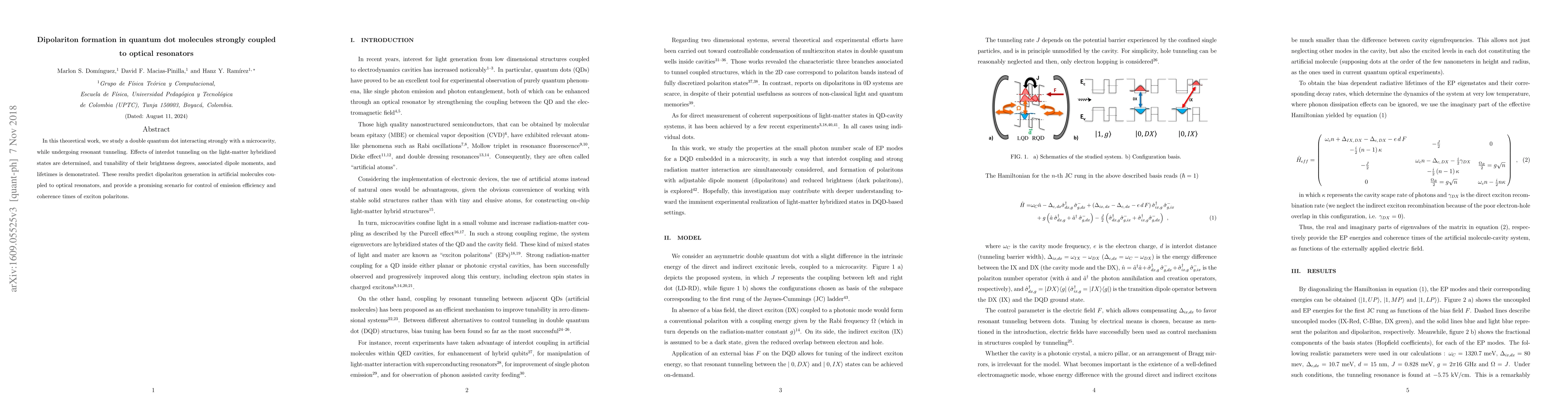 In this theoretical work, we study a double quantum dot interacting strongly with a microcavity, while undergoing resonant tunneling. Effects of interdot tunneling on the light-matter hybridized states are determined, and tunability of their brightness degrees and associated dipole moments is demonstrated. These results predict dipolariton generation in artificial molecules coupled to optical resonators, and provide a promising scenario for control of emission efficiency and coherence times of exciton polaritons.