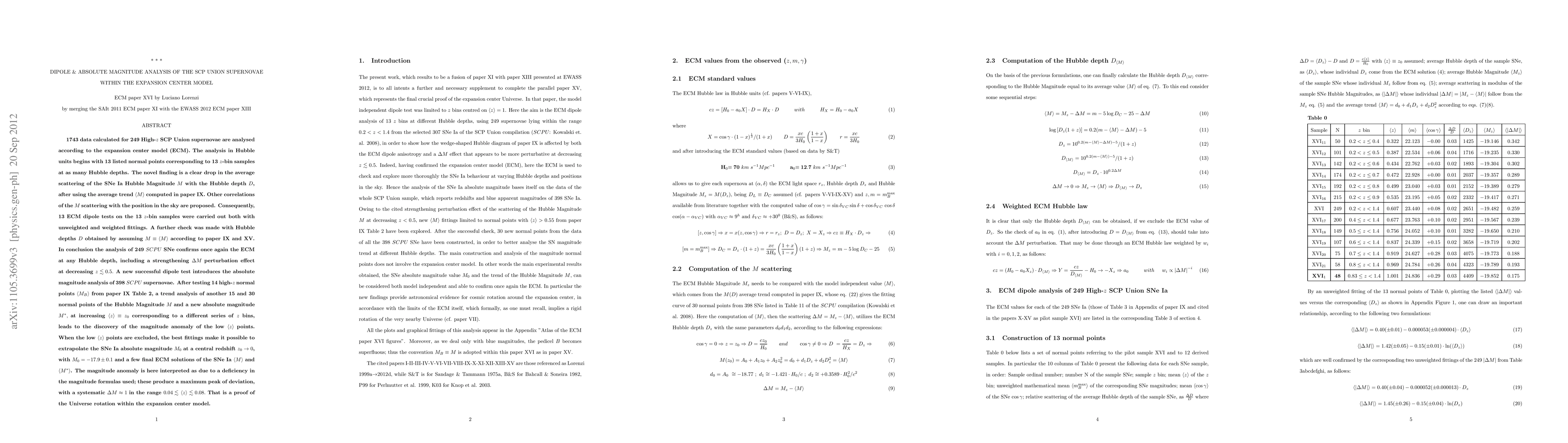 This paper analyzes 1743 data points from 249 high-z SCP Union supernovae using the expansion center model (ECM), revealing a decrease in the average scattering of the SNe Ia Hubble Magnitude M with ECM Hubble depth D. The study confirms ECM's validity and identifies a magnitude anomaly at low redshifts, interpreted as evidence of the Universe's rotation within the ECM framework.