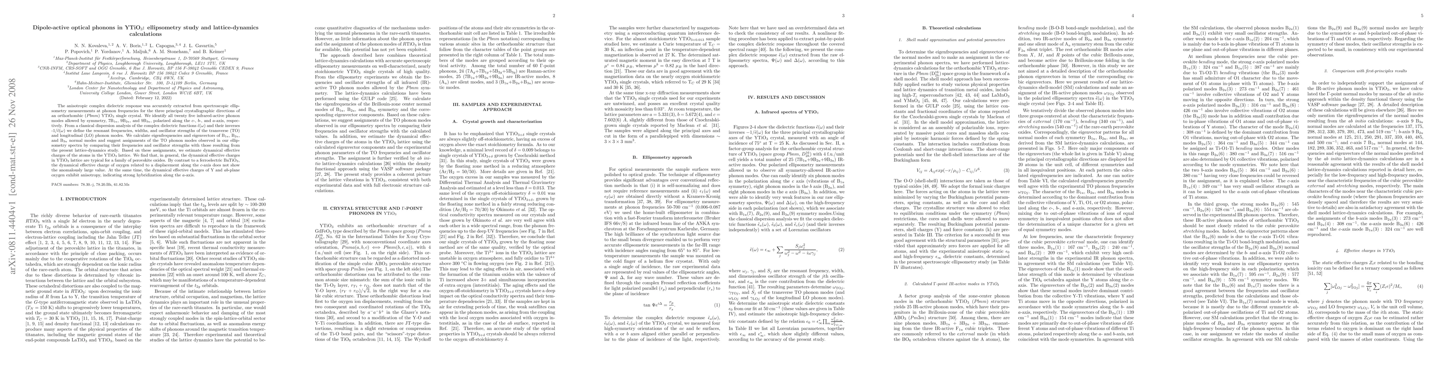 The study identifies all 25 infrared-active phonon modes in YTiO3 crystal using ellipsometry and lattice-dynamics calculations. It determines resonant frequencies, widths, and oscillator strengths of transverse and longitudinal phonon modes, estimating dynamical effective charges. Unlike ferroelectric BaTiO3, YTiO3 shows typical perovskite oxide charges, with anisotropic Y and ab-plane oxygen charges indicating strong hybridization along the a-axis.