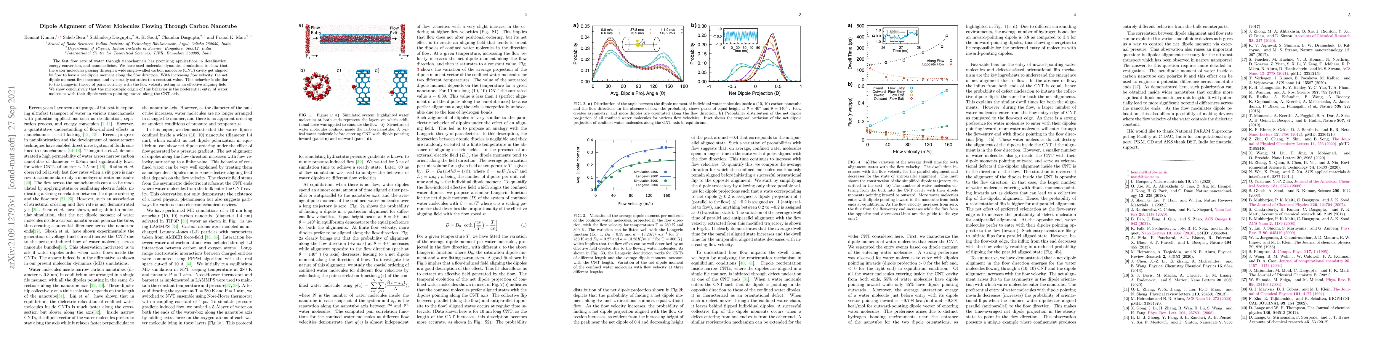 The fast flow rate of water through nanochannels has promising applications in desalination, energy conversion, and nanomedicine. We have used molecular dynamics simulations to show that the water molecules passing through a wide single-walled carbon nanotube (CNT) cavity get aligned by flow to have a net dipole moment along the flow direction. With increasing flow velocity, the net dipole moment first increases and eventually saturates to a constant value. This behavior is similar to the Langevin theory of paraelectricity with the flow velocity acting as an effective aligning field. We show conclusively that the microscopic origin of this behavior is the preferential entry of water molecules with their dipole vectors pointing inward along the CNT axis.