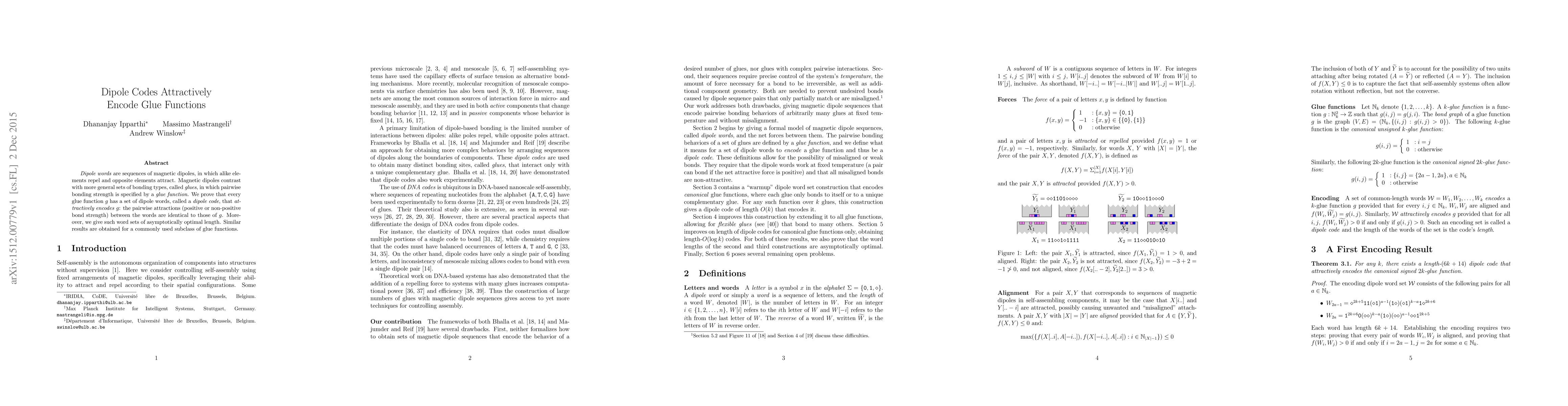 The paper proves that every glue function g has a set of dipole words, called a dipole code, that attractively encodes g, meaning the pairwise attractions between the words match those of g. It also provides asymptotically optimal length dipole codes.