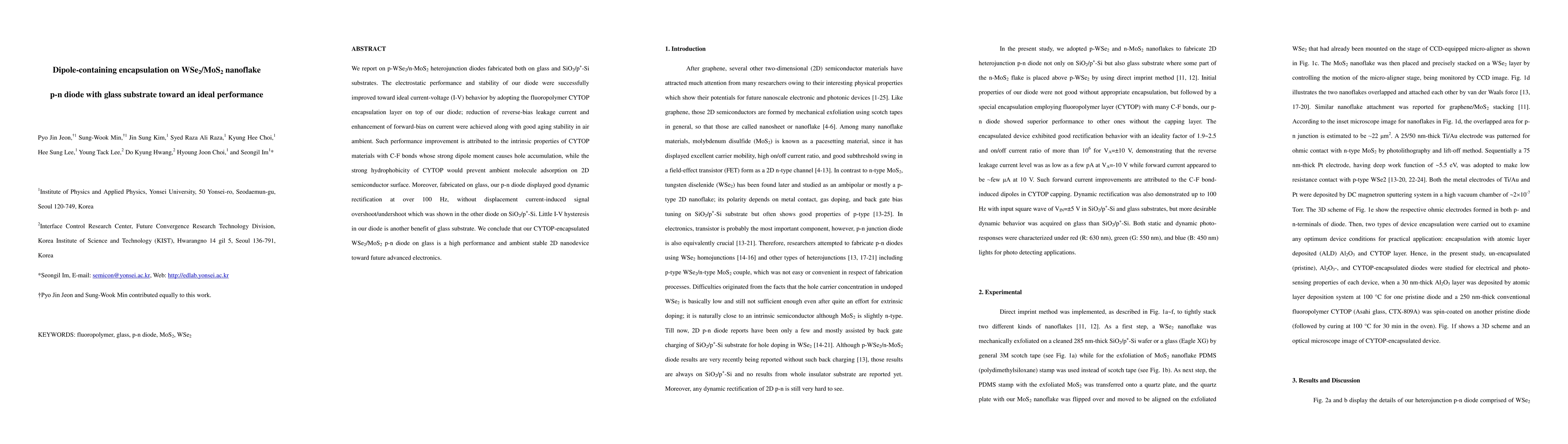 This paper reports on the fabrication of p-WSe2/n-MoS2 heterojunction diodes encapsulated with a fluoropolymer CYTOP layer, which significantly improves their electrostatic performance and stability. The CYTOP encapsulation reduces leakage current and enhances forward-bias current, leading to ideal current-voltage behavior and good aging stability, attributed to the material's strong dipole moment and hydrophobicity.