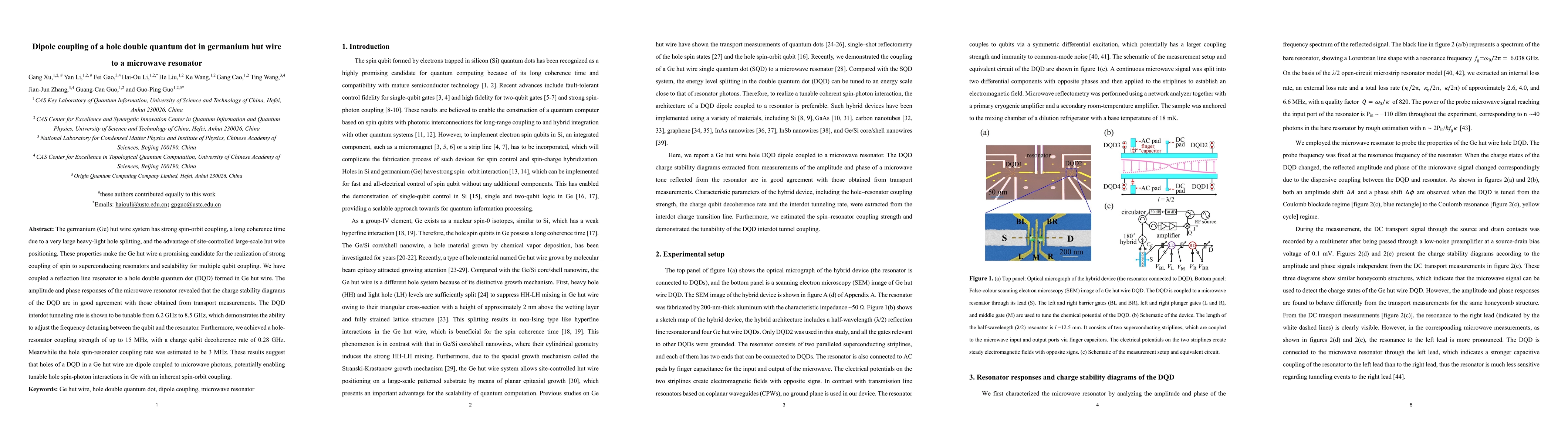This study demonstrates strong dipole coupling between a tunable hole double quantum dot (DQD) in germanium hut wire and a microwave resonator, achieving up to 15 MHz coupling strength, with a charge qubit decoherence rate of 0.28 GHz, and enabling tunable interdot tunneling rates from 6.2 GHz to 8.5 GHz.