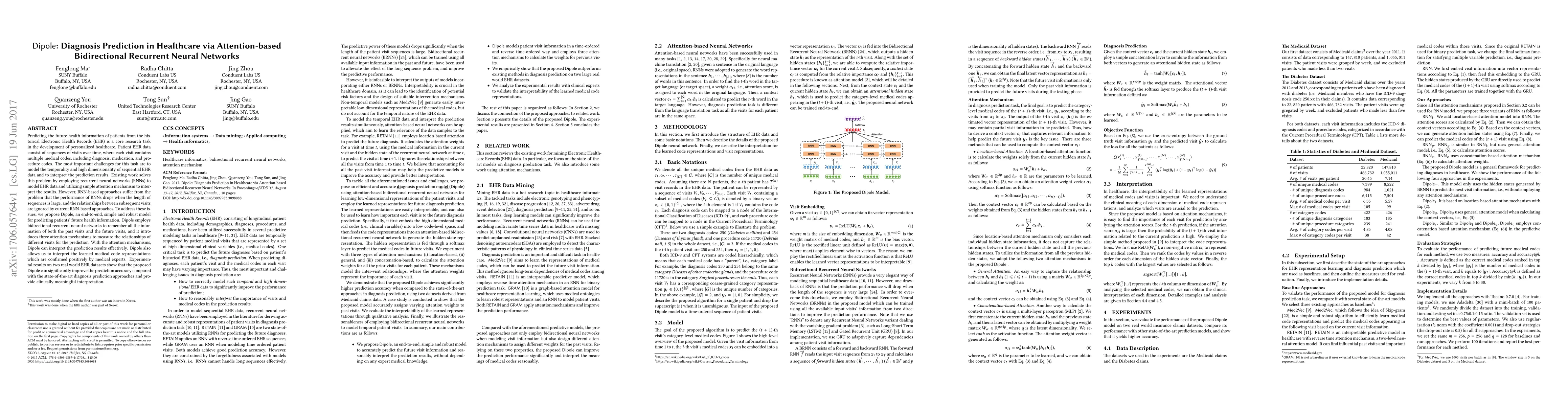 The paper proposes Dipole, a bidirectional recurrent neural network with attention mechanisms to predict future health information from historical Electronic Health Records (EHR). Dipole addresses the limitations of existing RNN-based approaches by modeling temporality and high dimensionality, improving prediction accuracy, and providing interpretable results validated by medical experts.
