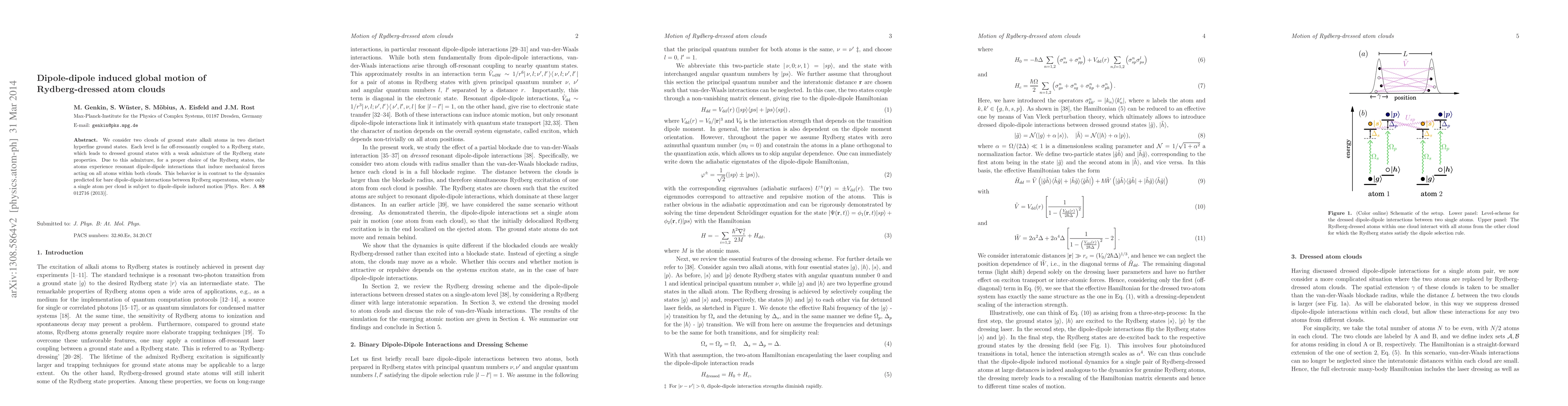 This paper investigates the global motion of two clouds of alkali atoms dressed by Rydberg states, revealing that dipole-dipole interactions induce mechanical forces on all atoms within both clouds, contrasting with the dynamics of bare dipole-dipole interactions in Rydberg superatoms.