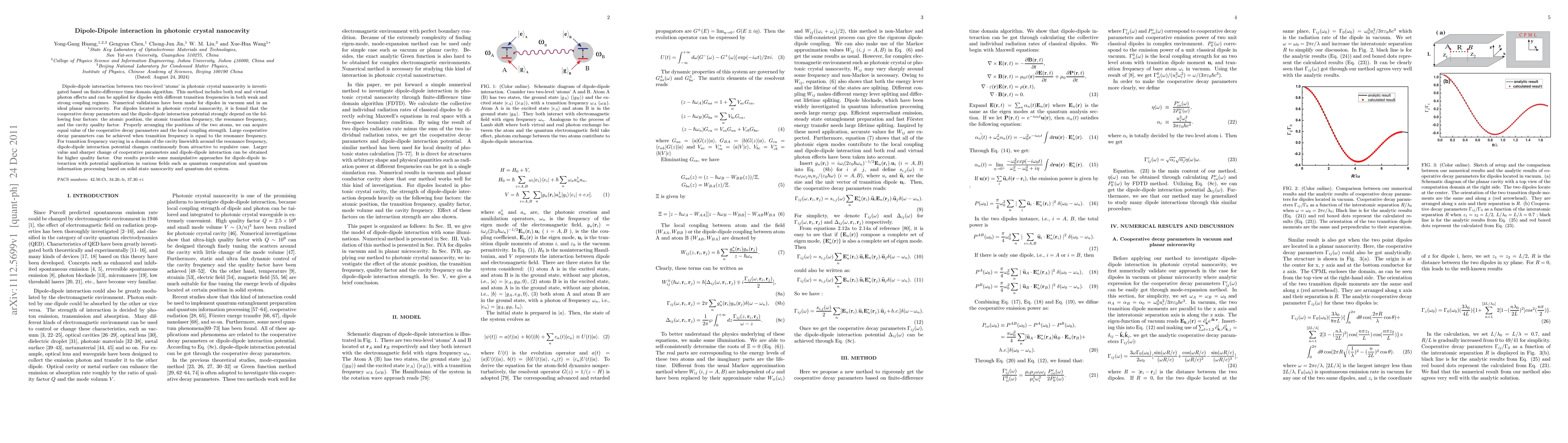 This paper investigates dipole-dipole interactions in photonic crystal nanocavities using a finite-difference time domain algorithm, revealing dependencies on atomic position, transition frequency, resonance frequency, and cavity quality factor. Manipulative approaches for achieving large cooperative decay parameters and tunable dipole-dipole interaction potentials are proposed for potential applications in quantum computation and information processing.