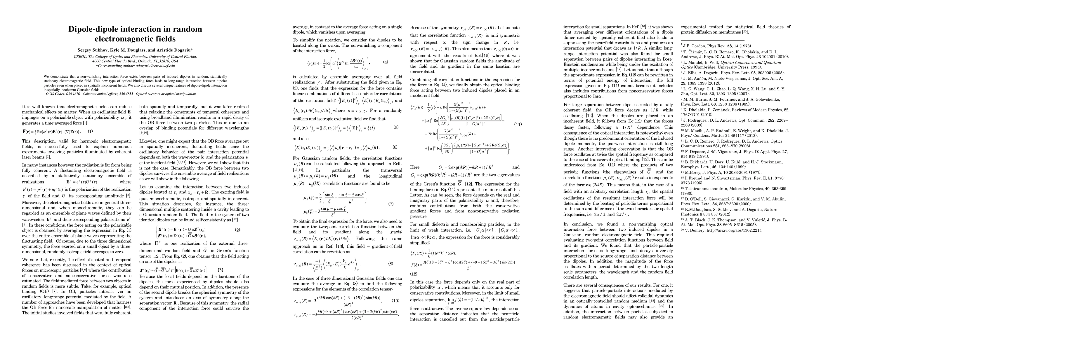Summary: This study reveals a non-vanishing interaction force between induced dipoles in random electromagnetic fields, termed optical binding, enabling long-range interactions in incoherent fields. The paper also explores unique characteristics of dipole-dipole interactions in spatially incoherent Gaussian fields.
