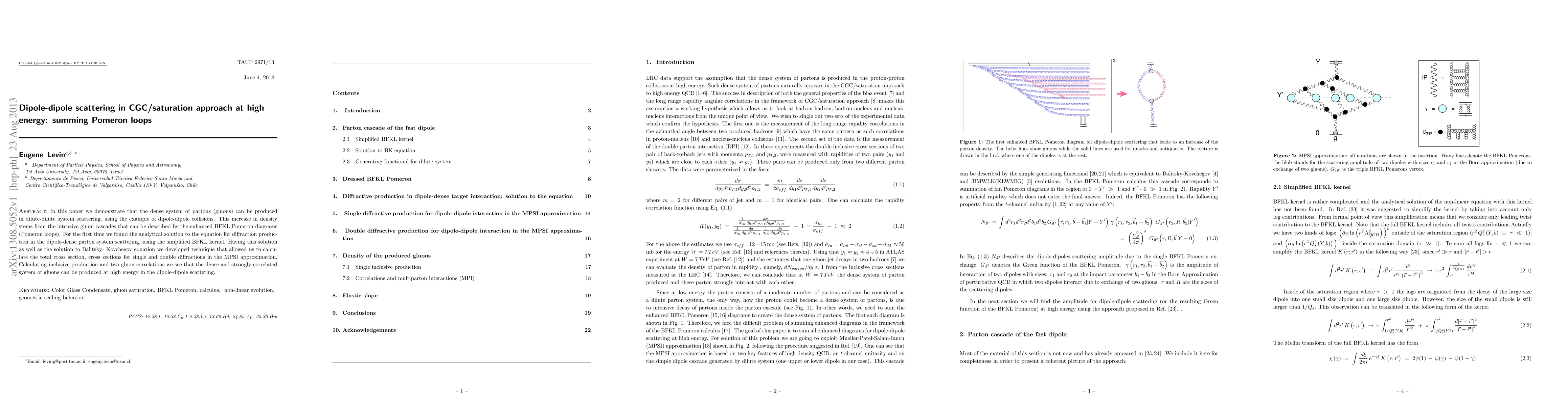 In this paper we demonstrate that the dense system of partons (gluons) can be produced in dilute-dilute system scattering, using the example of dipole-dipole collisions. This increase in density stems from the intensive gluon cascades that can be described by the enhanced BFKL Pomeron diagrams (Pomeron loops). For the first time we found the analytical solution to the equation for diffraction production in the dipole-dense parton system scattering, using the simplified BFKL kernel. Having this solution as well as the solution to Balitsky- Kovchegov equation we developed technique that allowed us to calculate the total cross section, cross sections for single and double diffractions in the MPSI approximation. Calculating inclusive production and two gluon correlations we see that the dense and strongly correlated system of gluons can be produced at high energy in the dipole-dipole scattering.