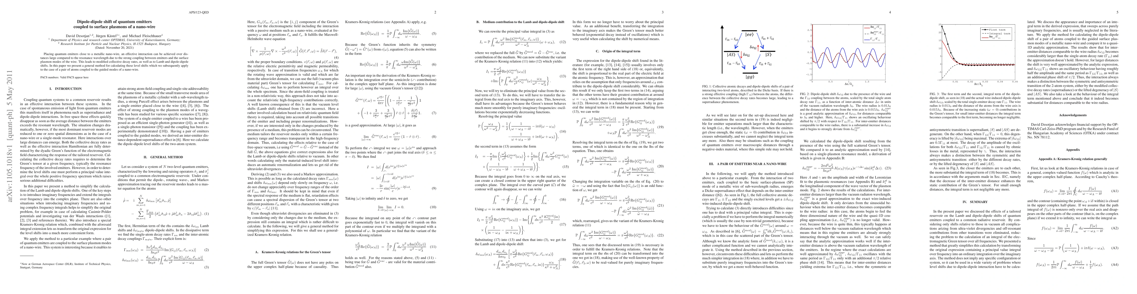 The research presents a method for calculating level shifts of quantum emitters coupled to surface plasmons of a nano-wire, simplifying the calculation of an integral over the electromagnetic Green's tensor over all frequencies using Kramers-Kronig relations.