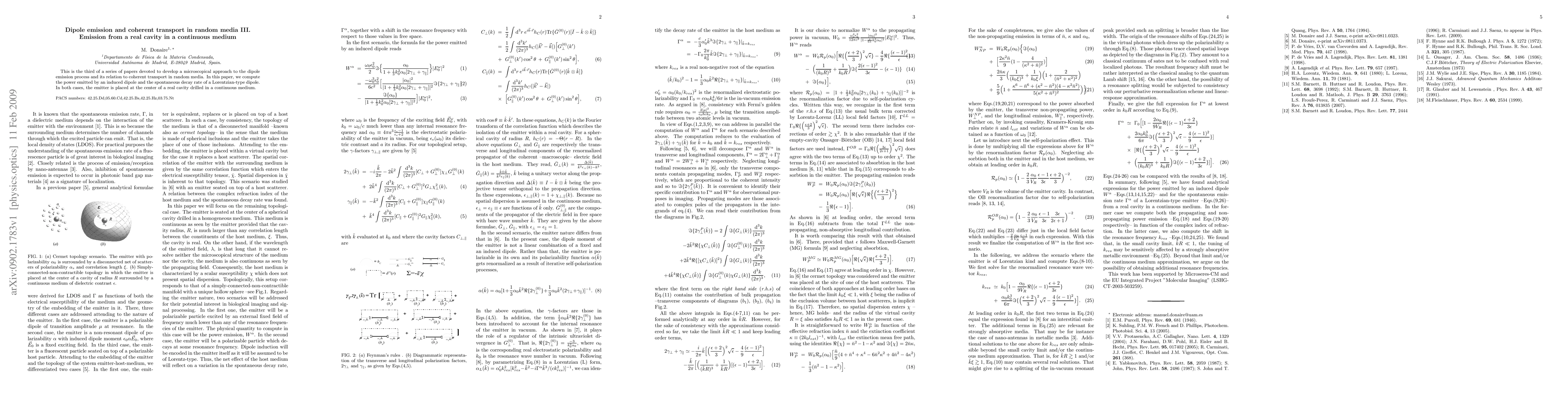 This is the third of a series of papers devoted to develop a microscopical approach to the dipole emission process and its relation to coherent transport in random media. In this paper, we compute the power emitted by an induced dipole and the spontaneous decay rate of a Lorentzian-type dipole. In both cases, the emitter is placed at the center of a real cavity drilled in a continuous medium.