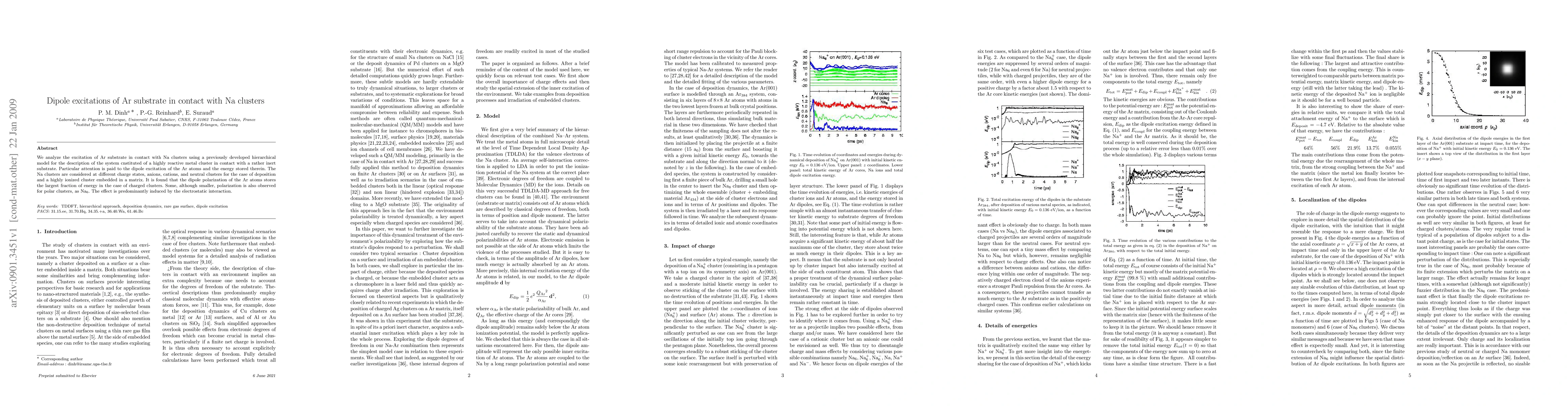 e analyze the excitation of Ar substrate in contact with Na clusters using a previously developed hierarchical model for the description of the system constituted of a highly reactive metal cluster in contact with a rather inert substrate. Particular attention is paid to the dipole excitation of the Ar atoms and the energy stored therein. The Na clusters are considered at different charge states, anions, cations, and neutral clusters for the case of deposition and a highly ionized cluster embedded in a matrix. It is found that the dipole polarization of the Ar atoms stores the largest fraction of energy in the case of charged clusters. Some, although smaller, polarization is also observed for polar clusters, as Na$_6$. The effect is predominantly induced by the electrostatic interaction.