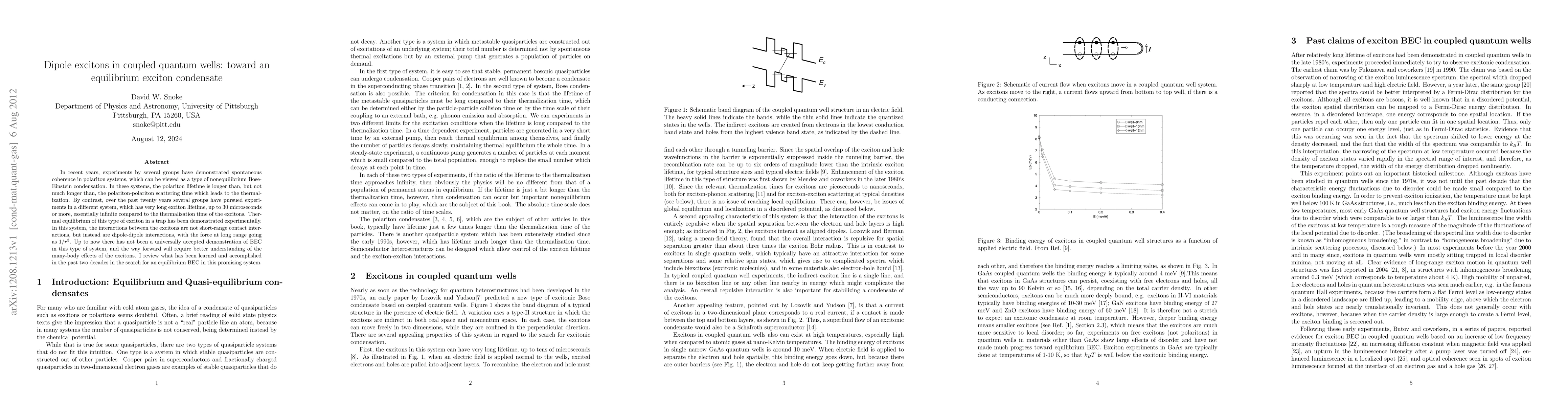 In recent years, experiments by several groups have demonstrated spontaneous coherence in polariton systems, which can be viewed as a type of nonequilibrium Bose-Einstein condensation. In these systems, the polariton lifetime is longer than, but not much longer than, the polariton-polariton scattering time which leads to the thermalization. By contrast, over the past twenty years several groups have pursued experiments in a different system, which has very long exciton lifetime, up to 30 microseconds or more, essentially infinite compared to the thermalization time of the excitons. Thermal equilibrium of this type of exciton in a trap has been demonstrated experimentally. In this system, the interactions between the excitons are not short-range contact interactions, but instead are dipole-dipole interactions, with the force at long range going as $1/r^{3}$. Up to now there has not been a universally accepted demonstration of BEC in this type of system, and the way forward will require better understanding of the many-body effects of the excitons. I review what has been learned and accomplished in the past two decades in the search for an equilibrium BEC in this promising system.