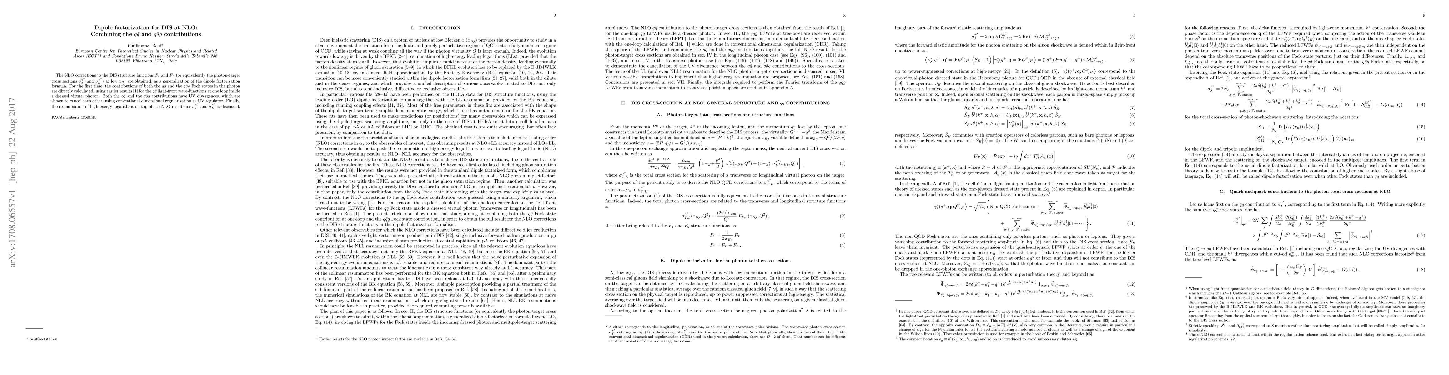 This paper presents NLO corrections for DIS structure functions $F_2$ and $F_L$ by combining $q\bar{q}$ and $q\bar{q}g$ contributions, showing that their UV divergences cancel each other, and discusses the resummation of high-energy logarithms.