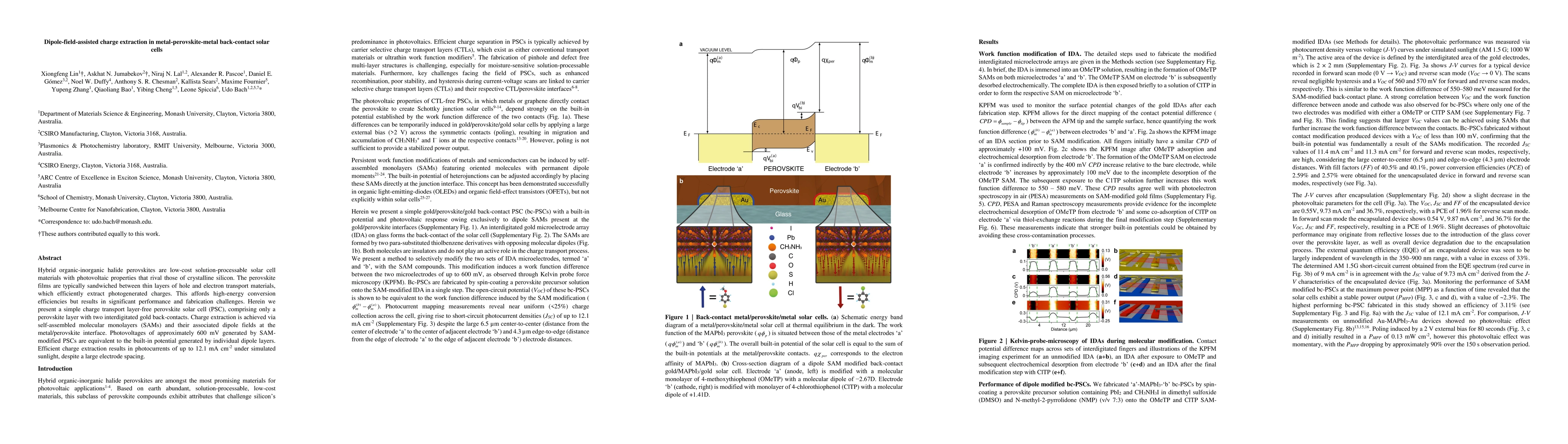 This paper proposes a novel charge extraction method in perovskite solar cells using self-assembled molecular monolayers (SAMs) to create dipole fields at the metal/perovskite interface, achieving photocurrents of up to 12.1 mA/cm² without the need for traditional charge transport layers.