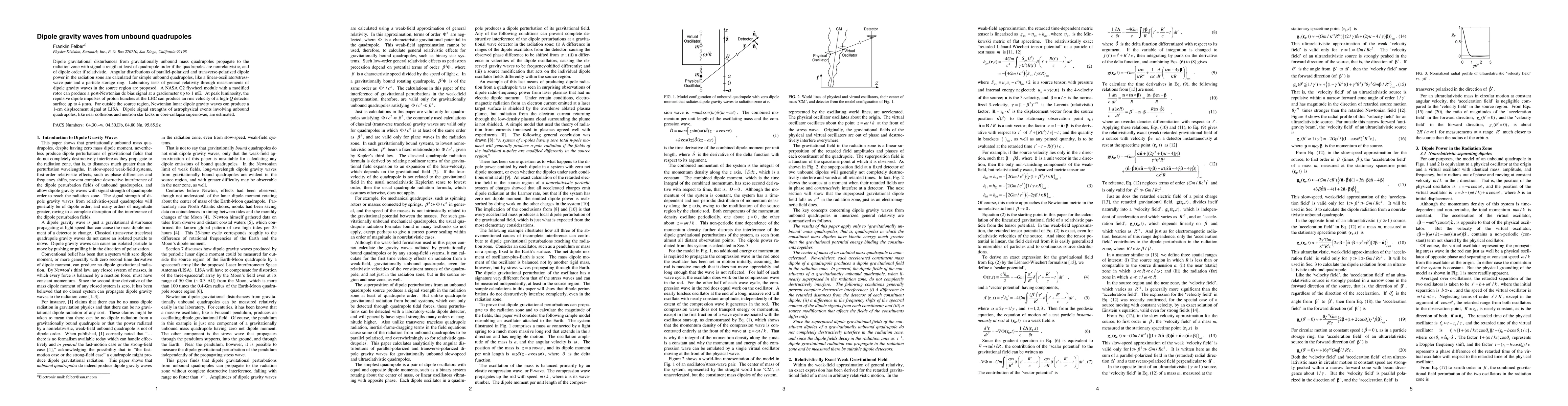 Dipole gravitational disturbances from gravitationally unbound mass quadrupoles propagate to the radiation zone with signal strength at least of quadrupole order if the quadrupoles are nonrelativistic, and of dipole order if relativistic. Angular distributions of parallel-polarized and transverse-polarized dipole power in the radiation zone are calculated for simple unbound quadrupoles, like a linear-oscillator/stress-wave pair and a particle storage ring. Laboratory tests of general relativity through measurements of dipole gravity waves in the source region are proposed. A NASA G2 flywheel module with a modified rotor can produce a post-Newtonian dc bias signal at a gradiometer up to 1 mE. At peak luminosity, the repulsive dipole impulses of proton bunches at the LHC can produce an rms velocity of a high-Q detector surface up to 4 micron/s. Far outside the source region, Newtonian lunar dipole gravity waves can produce a 1-cm displacement signal at LISA. Dipole signal strengths of astrophysical events involving unbound quadrupoles, like near collisions and neutron star kicks in core-collapse supernovae, are estimated.